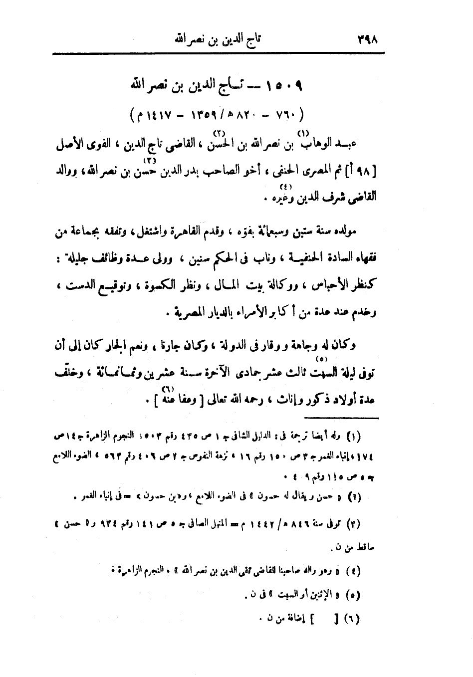 عبد الوهاب بن نصر الله بن الحسن، القاضي تاج الدين، الفوي الأصل ثم المصري الحنفي، أخو الصاحب بدر الدين حسن بن نصر الله، ووالد القاضي شرف الدين وغيره، مولده سنة ستين وسبعمائة بفوه، وقدم القاهرة واشتغل، وتفقه بجماعة من فقهاء السادة الحنفية، وناب في الحكم سنين، وولي عدة وظائف جليلة: كنظر الأحباس، ووكالة بيت المال، ونظر الكسوة، وتوقيع الدست، وخدم عند عدة من أكابر الأمراء بالديار المصرية.