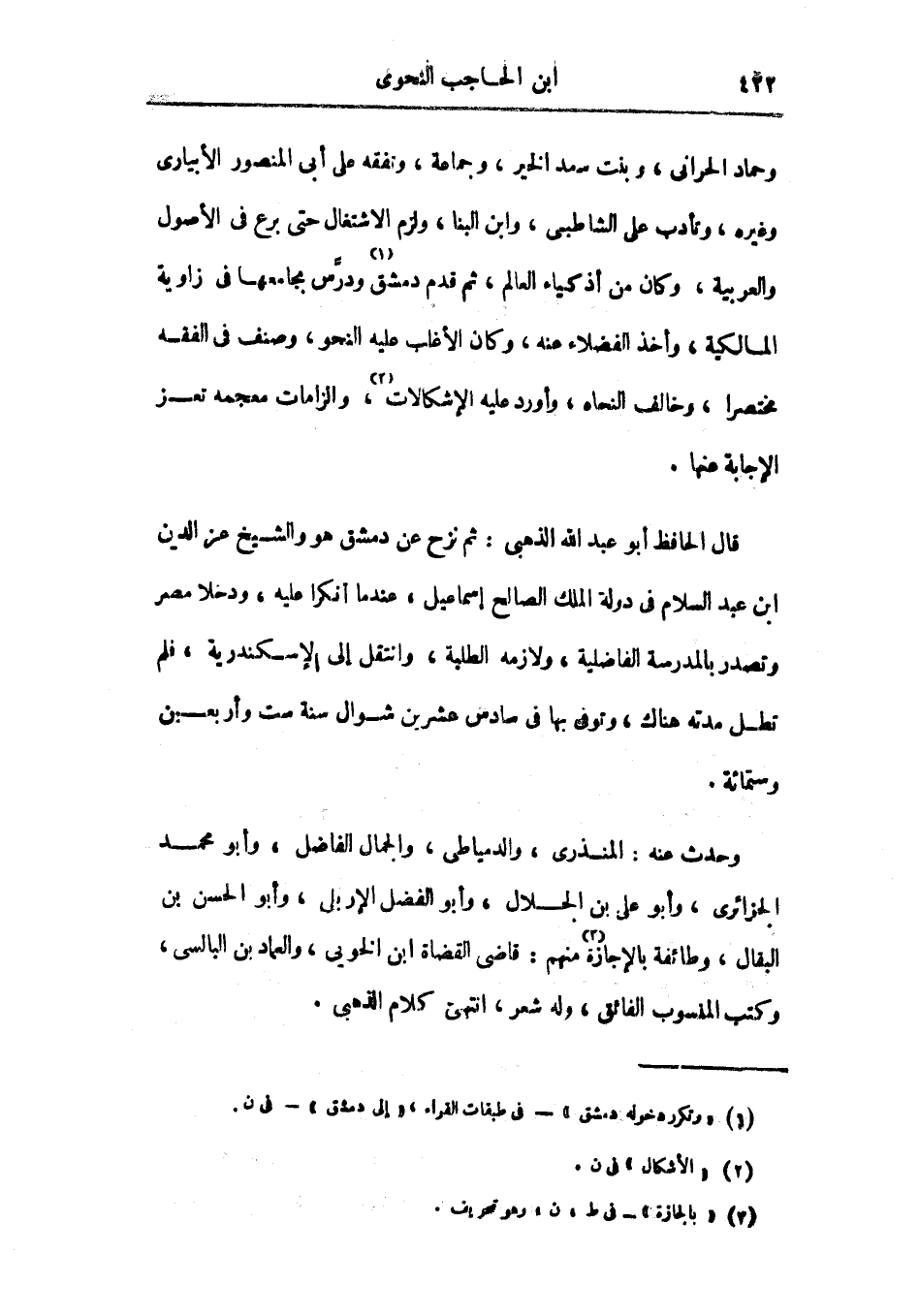 وحماد الحراني، وبنت سعد الخير، وجماعة، وتفقه على أبي المنصور الأبياري وغيره، وتأدب على الشاطبي، وابن البنا، ولزم الاشتغال حتى برع في الأصول والعربية، وكان من أذكياء العالم، ثم قدم دمشق ودرس بجامعها في زاوية المالكية، وأخذ الفضلاء عنه، وكان الأغلب عليه النحو، وصنف في الفقه مختصراً، وخالف النحاة، وأورد عليه الإشكالات، والزامات معجمه تعز الإجابة عنها.
