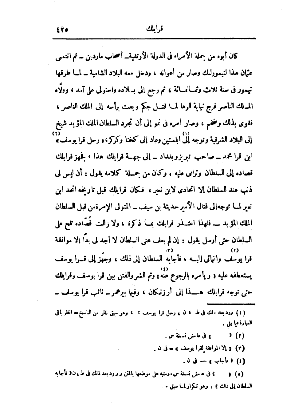 كان أبوه من جملة الأمراء في الدولة الأرتفية - أصحاب ماردين - ثم انتمى عثمان هذا لتيمورلنك وصار من أعوانه، ودخل معه البلاد الشامية، لما طرقها تيمور في سنة ثلاث وثمانمائة، ثم رجع إلى بلاده واستولى على آمد، وولاه الملك الناصر فرج نيابة الرها لما قتل جكم وبعث برأسه إلى الملك الناصر، فقوي بذلك وضخم، وصار أمره في نمو إلى أن تجرد السلطان الملك المؤيد شيخ إلى البلاد الشرقية وتوجه إلى ابلستين وعاد إلى كختا وكركر، رحل قرا يوسف ابن قرا محمد صاحب تبريز وبغداد إلى جهة قرايلك هذا. فجهز قرايلك قصاده إلى السلطان وترامى عليه، وكان من جملة كلامه يقول: أن ليس لي ذنب عند السلطان إلا اتحادي لابن نعير، فكان قرايلك قبل تاريخه اتحد ابن نعير لما توجه إلى قتال الأمير حديثة بن سيف المتولي الإمرة من قبل السلطان الملك المؤيد، فلهذا اعتذر قرايلك بما ذكرنا، ولا زالت قصاده تلح على السلطان حتى أرسل يقول: إن لم يعف عني السلطان لا أجد لي بداً إلا موافقة قرا يوسف وانتمائي إيه، فأجابه السلطان إلى ذلك، وجهز إلى قرا يوسف يستعطفه عليه ويأمره بالرجوع عنه وتم الشر والفتن بين قرا يوسف وقرايلك حتى توجه قرايلك هـ إلى أرزنكان، وفيها بيرعمر نائب قرا يوسف