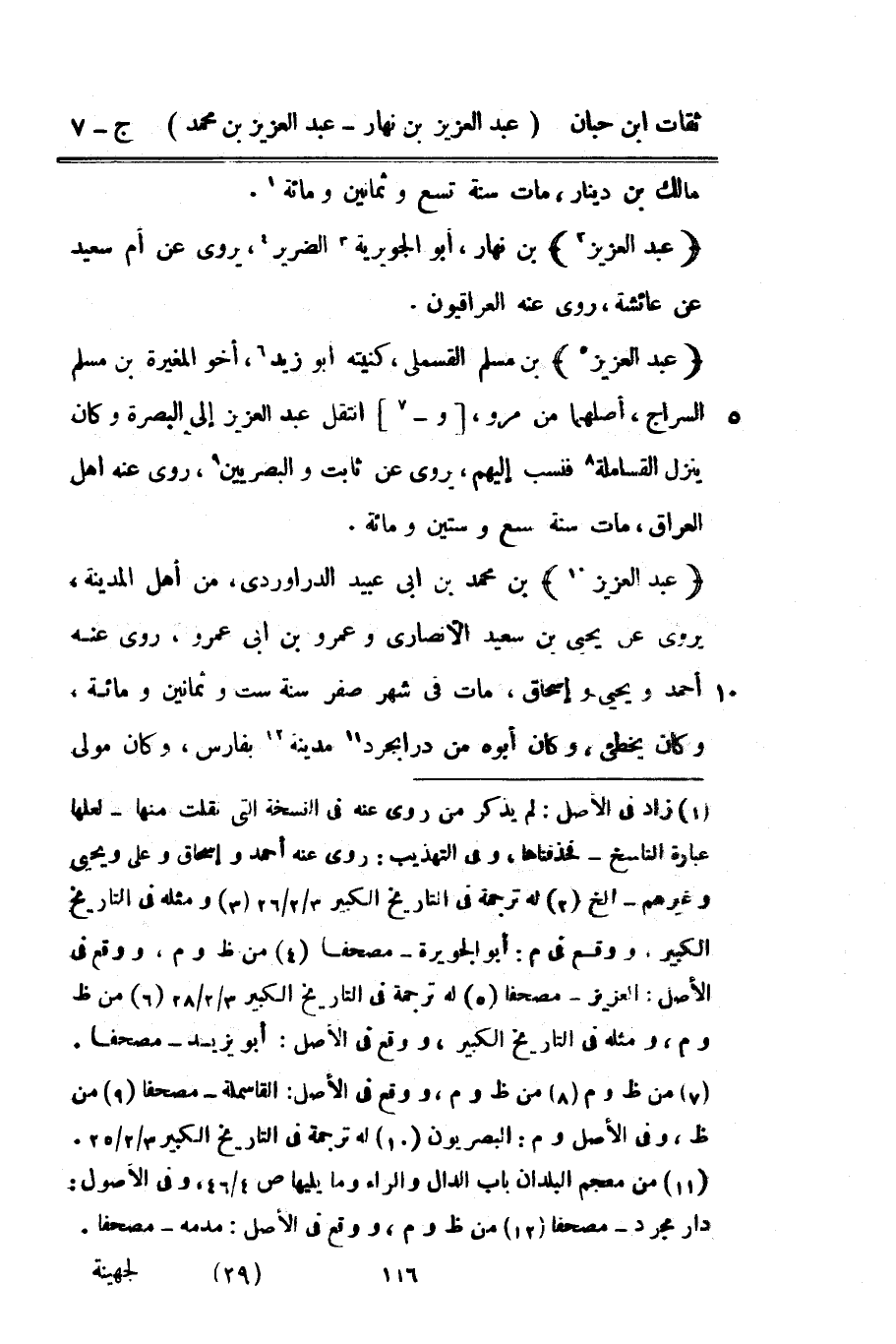 9255 - عبد الْعَزِيز بن مُحَمَّد بن أبي عبيد الدَّرَاورْدِي من أهل الْمَدِينَة يروي عَنْ يَحْيَى بْنِ سَعِيدٍ الأَنْصَارِيِّ وَعَمْرو بن أبي عَمْرو روى عَنْهُ أَحْمد ويَحْيَى وَإِسْحَاق مَاتَ فِي شهر صفر سنة سِتّ وَثَمَانِينَ وَمِائَة وَكَانَ يخطىء وَكَانَ أَبوهُ من درابجرد مَدِينَة بِفَارِس وَكَانَ مولى