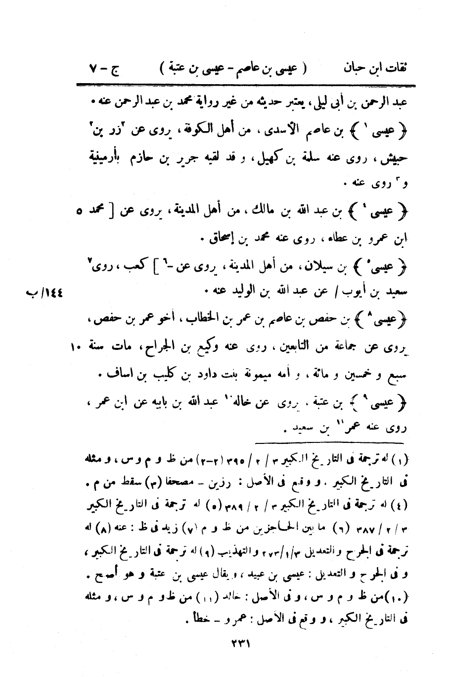 9819 - عِيسَى بْن حَفْص بْن عَاصِم بن عمر بْن الْخطاب أَخُو عمر بْن حَفْص يروي عَنْ جمَاعَة من التَّابِعين روى عَنهُ وَكِيع بْن الْجراح مَاتَ سنة سبع وَخمسين وَمِائَة وَأمه مَيْمُونَة بنت دَاوُد بْن كُلَيْب بْن إساف
