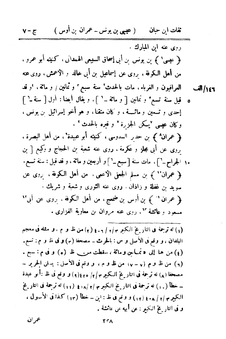 9857 - عِيسَى بْن يُونُس بْن أبي إِسْحَاق السبيعِي الْهَمدَانِي كنيته أَبُو عَمْرٍو مِنْ أَهْلِ الْكُوفَةِ يروي عَن إِسْمَاعِيل بن أبي خَالِد وَالْأَعْمَش روى عَنْهُ الْعِرَاقِيُّونَ والغرباء مَاتَ بِالْحَدَثِ سنة سبع وَثَمَانِينَ وَمِائَة وَقد قيل سنة تسع وَثَمَانِينَ وَمِائَة وَيُقَال أَيْضا أول سنة إِحْدَى وَتِسْعين وَمِائَة وَكَانَ متقنا وَهُوَ أَخُو إِسْرَائِيل بْن يُونُس وَكَانَ عِيسَى يسكن الجزيرة وقبره بِالْحَدَثِ