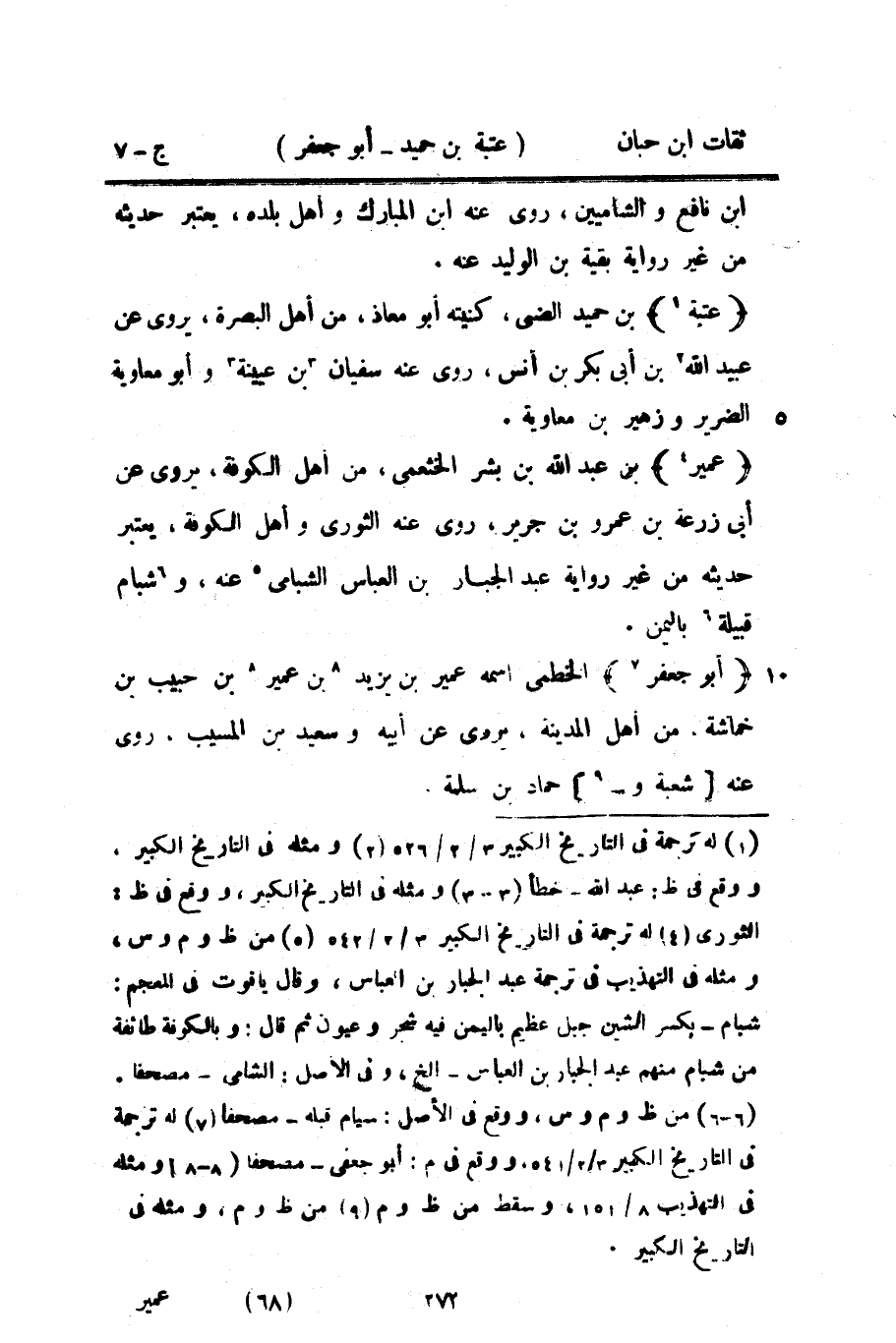 10027 - عُمَيْر بْن عَبْد اللَّهِ بْن بشر الْخَثْعَمِي من أهل الْكُوفَة يروي عَن أبي زرْعَة بْن عَمْرو بْن جرير روى عَنهُ الثَّوْريّ وَأهل الْكُوفَة يعْتَبر حَدِيثه من غير رِوَايَة عبد الْجَبَّار بْن الْعَبَّاس الشبامي عَنْهُ وشبام قَبيلَة بِالْيمن