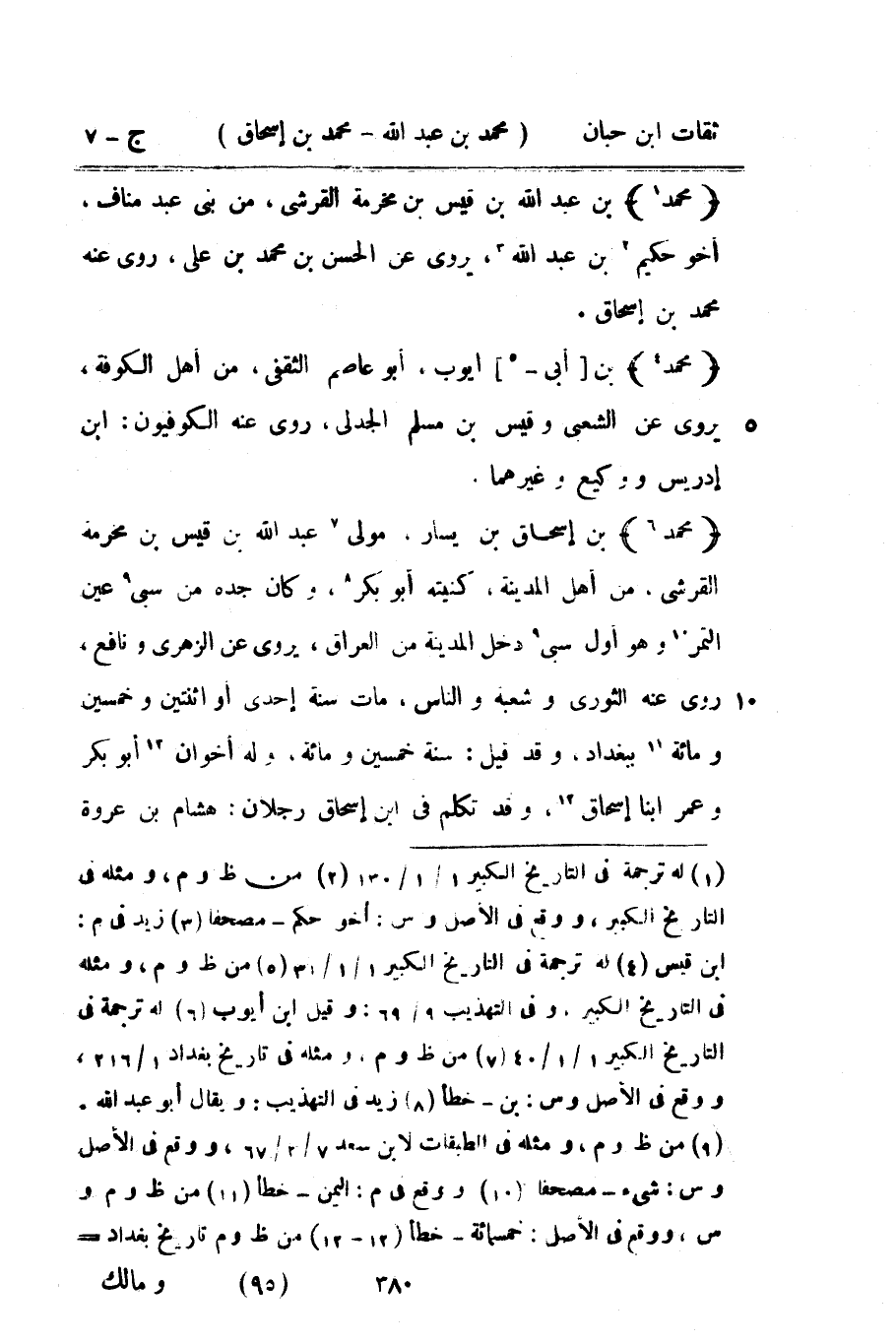 10534 - مُحَمَّد بن إِسْحَاق بن يسَار مولى عبد الله بْن قَيْس بْن مخرمَة الْقرشِي من أهل الْمَدِينَة كُنْيَتُهُ أَبُو بكر وَكَانَ جده من سبي عين التَّمْر وَهُوَ أول سبي دخل الْمَدِينَة من الْعرَاق يروي عَن الزُّهْرِيّ وَنَافِع روى عَنْهُ الثَّوْرِيُّ وَشُعْبَةُ وَالنَّاسُ مَاتَ سنة إِحْدَى أَو اثْنَتَيْنِ وَخمسين وَمِائَة بِبَغْدَاد وَقد قيل سنة خمسين وَمِائَة وَله أَخَوان أَبُو بكر وَعمر ابْنا إِسْحَاق وَقد تكلم فِي بن إِسْحَاق رجلَانِ هِشَام بن عُرْوَة