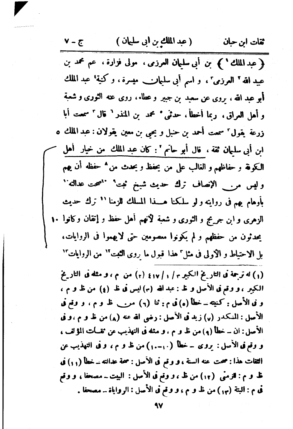 9168 - عبد الْملك بن أبي سُلَيْمَان الْعَرْزَمِي مولى فَزَارَة عَم مُحَمَّد بْن عبيد اللَّه الْعَرْزَمِي وَاسم أبي سُلَيْمَان ميسرَة وكنية عبد الْملك أَبُو عَبْد اللَّهِ يروي عَن سعيد بن جُبَير وَعَطَاء روى عَنهُ الثَّوْريّ وَشعْبَة وَأهل الْعرَاق رُبمَا أَخطَأ حَدَّثَنِي مُحَمَّد بْن الْمُنْذر قَالَ سَمِعت أَبَا زرْعَة يَقُول سَمِعت أَحْمد بْن حَنْبَل ويَحْيَى بْن معِين يَقُولَانِ عبد الْملك بن أبي سُلَيْمَان ثِقَة قَالَ أَبُو حَاتِم كَانَ عبد الْملك من خِيَار أهل الْكُوفَة وحفاظهم وَالْغَالِب على من يحفظ وَيحدث من حفظه أَن يهم وَلَيْسَ من الْإِنْصَاف ترك حَدِيث شيخ ثَبت صحت عَدَالَته بأوهام يهم فِي رِوَايَته وَلَو سلكنا هَذَا المسلك للزمنا ترك حَدِيث الزُّهْرِيّ وَابْن جريج وَالثَّوْري وَشعْبَة لأَنهم أهل حفظ وإتقان وَكَانُوا يحدثُونَ من حفظهم وَلم يَكُونُوا معصومين حَتَّى لَا يهموا فِي الرِّوَايَات بل الِاحْتِيَاط وَالْأولَى فِي مثل هَذَا قبُول مَا يرْوى الثبت من الرِّوَايَات