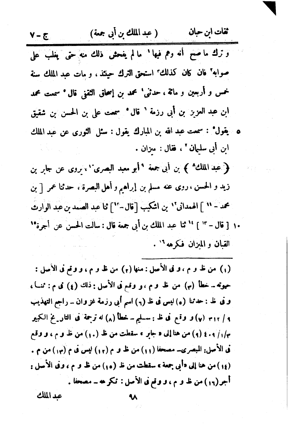 وَترك مَا صَحَّ أَنَّهُ وهم فِيهَا مَا لم يفحش ذَلِك مِنْهُ حَتَّى يغلب على صَوَابه فان كَانَ كَذَلِك اسْتحق التّرْك حِينَئِذٍ وَمَات عبد الْملك سنة خمس وَأَرْبَعين وَمِائَة حَدَّثَنِي مُحَمَّد بْن إِسْحَاق الثَّقَفِيّ قَالَ سَمِعت مُحَمَّد بْن عبد الْعَزِيز بْن أبي رزمة قَالَ سَمِعت عَليّ بْن الْحسن بْن شَقِيق يَقُول سَمِعت عَبْد اللَّهِ بْن الْمُبَارك يَقُول سُئِلَ الثَّوْريّ عَنْ عبد الْملك بْن أبي سُلَيْمَان فَقَالَ ميزَان
