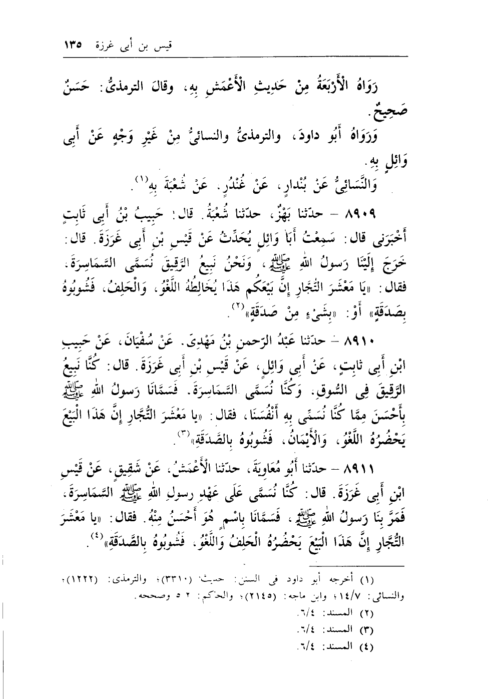 8911 - حدثنا أبو معاوية، حدثنا الأعمش، عن شقيق، عن قيس بن أبي غرزة. قال: كنا نسمي على عهد رسول الله - صلى الله عليه وسلم - السماسرة، فمر بنا رسول الله - صلى الله عليه وسلم -، فسمانا باسم هو أحسن منه. فقال: ((يامعشر التجار إن هذا البيع يحضره الحلف واللغو، فشوبوه بالصدقة)) (¬3) .
