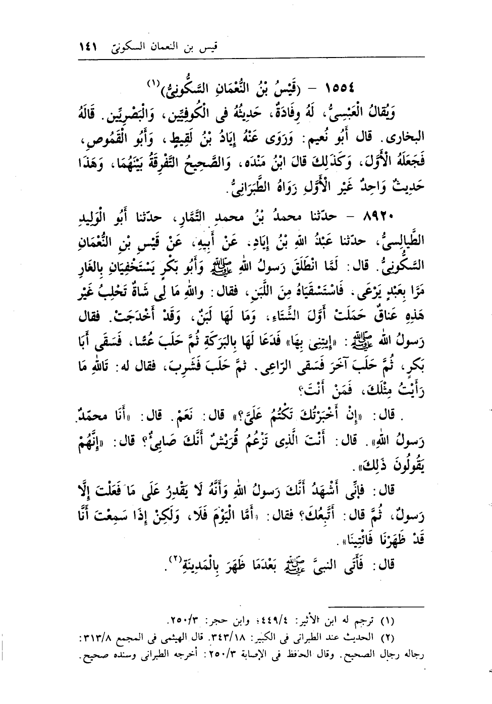 (¬2) الحديث عند الطبراني في الكبير، 18/343. قال الهيثمي في المجمع، 8/313: رجاله رجال الصحيح. وقال الحافظ في الإصابة، 3/250: أخرجه الطبراني ونسده صحيح.
