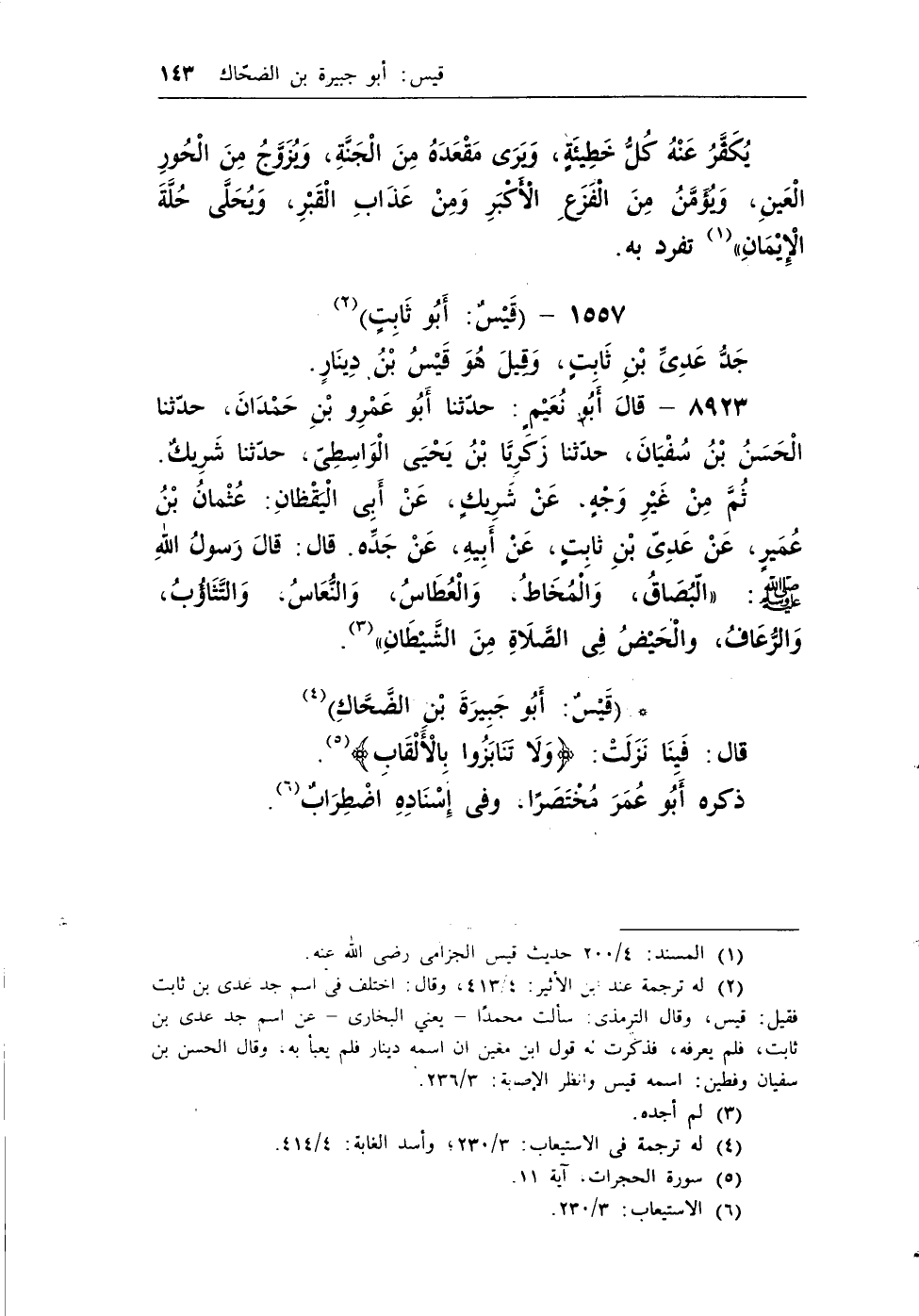 (¬1) له ترجمة عند ابن الأثير، 4/413، وقال: اختلف في اسم جد عدي بن ثابت فقيل: قيس، وقال الترمذي: سألت محمداً -يعني البخاري- عن اسم جد عدي بن ثابت، فلم يعرفه، فذكرت له قول ابن معين أن اسمه دينار فلم يعبأ به، وقال الحسن بن سفيان وفطين: اسمه قيس. وانظر الإصابة، 3/236.