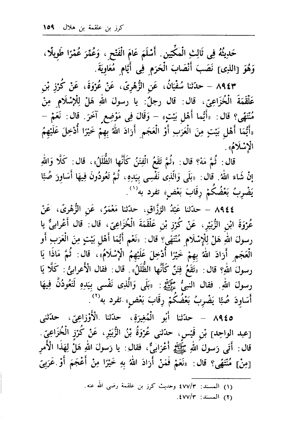 8944 - حدثنا عبد الرزاق، حدثنا معمر، عن الزهري، عن عروة بن الزبير، عن كرز بن علقمة الخزاعي، قال: قال أعرابي يارسول الله هل للإسلام منتهى؟ قال: ((نعم أيما أهل بيت من العرب أو العجم أراد الله بهم خيراً أدخل عليهم الإسلام)) ، قال: ثم ماذا يارسول الله؟ قال: ((تقع فتن كأنها الظلل)) . قال: فقال الأعرابي: كلا يارسول الله. فقال النبي - صلى الله عليه وسلم -: ((بلى والذي نفسي بيده لتعودن فيها أساود صباً يضرب بعضكم رقاب بعض)) (¬2) . تفرد به.