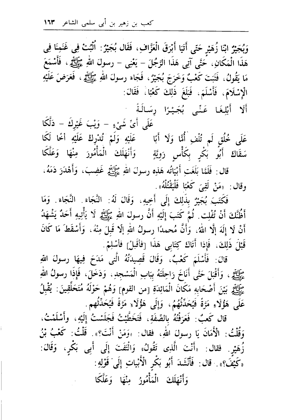 وبجير ابنا زهير حتى أتيا أبرق العزاف، فقال بجير: اثبت في غنمنا في هذا المكان، حتى آتى هذا الرجل -يعني- رسول الله - صلى الله عليه وسلم -، فعرض عليه الإسلام، فأسلم، فبلغ ذلك كعباً فقال: