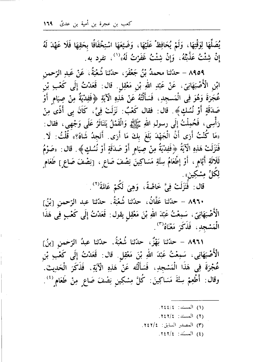 8961 - حدثنا بهز، حدثنا شعبة، حدثنا عبد الرحمن [بن] الأصبهاني سمعت عبد الله بن معقل. قال: قعدت إلى كعب بن عجرة في هذا المسجد، فسألته عن هذه الآية، فذكر الحديث. وقال: أطعم ستة مساكين: كل مسكين نصف صاع من طعام (¬3) .
