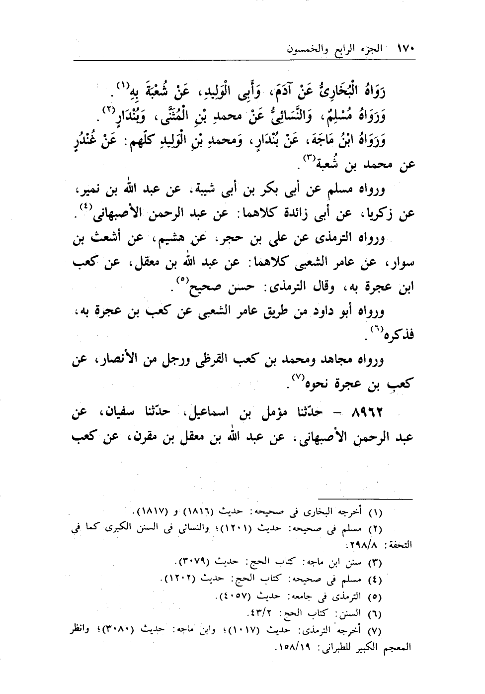 ورواه الترمذي عن علي بن حجر، عن هشيم، عن أشعث بن سوار، عن عامر الشعبي كلاهما: عن عبد الله بن معقل، عن كعب بن عجرة به، وقال الترمذي: حسن صحيح (¬5) .