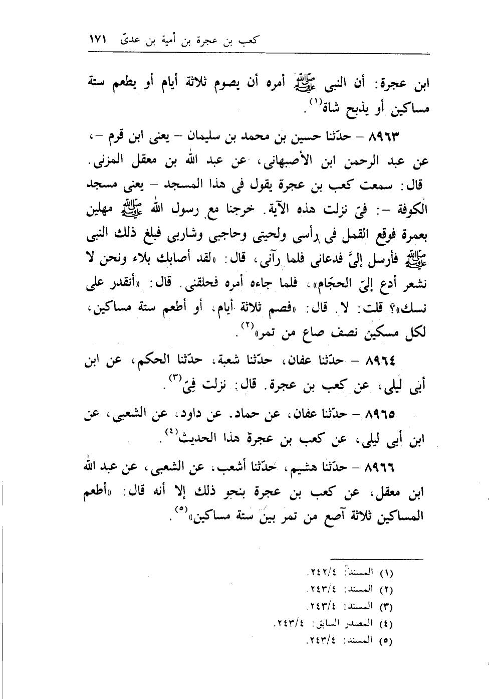 8966 - حدثنا هشيم، حدثنا أشعب، عن الشعبي، عن عبد الله بن معقل، عن كعب بن عجرة بنحو ذلك إلا أنه قال: ((أطعم المساكين ثلاثة آصع من تمر بين ستة مساكين)) (¬4) .