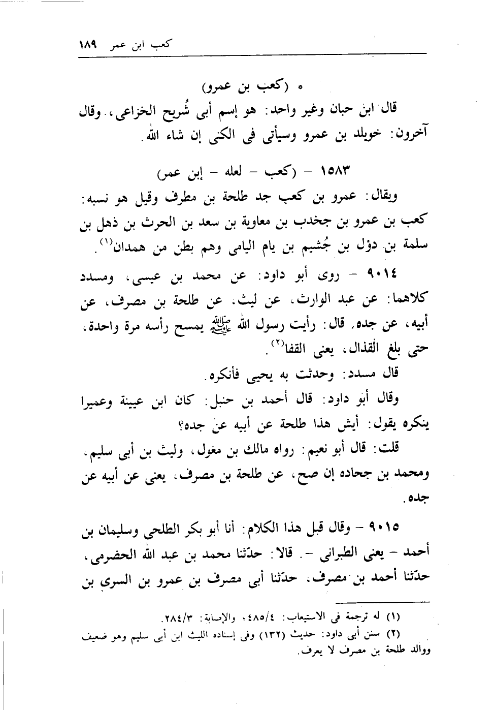 وقال أبو داود: قال أحمد بن حنبل: كان ابن عيينة وعميراً ينكره يقول: أيش هذا طلحة عن أبيه عن جده؟