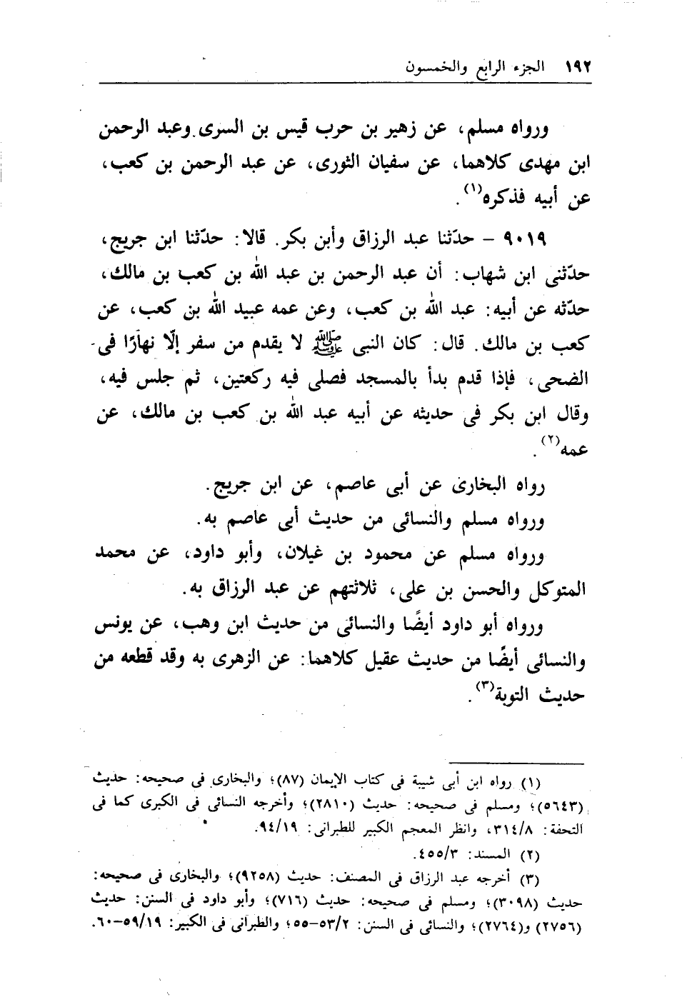 9019 - حدثنا عبد الرزاق وابن بكر. قالا: حدثنا ابن جريج، حدثني ابن شهاب: أن عبد الرحمن بن عبد الله بن كعب بن مالك، حدثه عن أبيه: عبد الله بن كعب، وعن عمه عبيد الله بن كعب، عن كعب بن مالك. قال: كان النبي - صلى الله عليه وسلم - لايقدم من سفر إلا نهاراً في الضحى، فإذا قدم بدأ بالمسجد فصلى فيه ركعتين، ثم جلس فيه، وقال ابن بكر في حديثه عن أبيه عبد الله بن كعب بن مالك، عن عمه (¬1) .