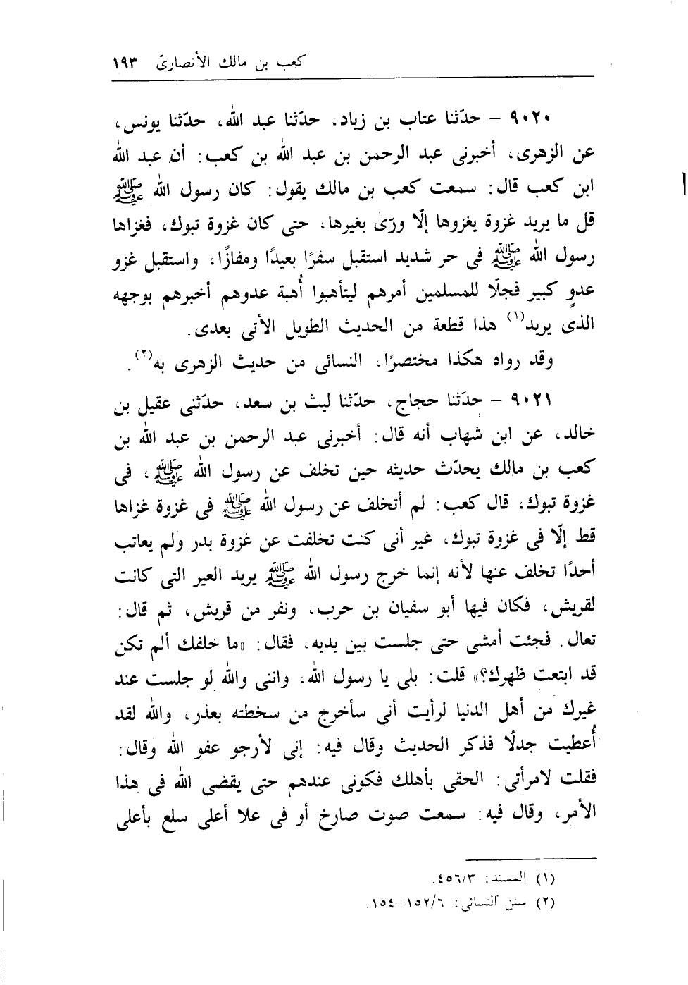 9021 - حدثنا حجاج، حدثنا ليث بن سعد، حدثني عقيل بن خالد، عن ابن شهاب أنه قال: أخبرني عبد الرحمن بن عبد الله بن كعب بن مالك يحدث حديثه حين تخلف عن رسول الله - صلى الله عليه وسلم -، في غزوة تبوك، قال كعب: لم أتخلف عن رسول الله - صلى الله عليه وسلم - في غزوة غزاها قط إلا في غزوة تبوك، غير أني كنت تخلفت عن غزوة بدر ولم يعاتب أحداً تخلف عنها لأنه إنما خرج رسول الله - صلى الله عليه وسلم - يريد العير التي كانت لقريش، فكان فيها أبو سفيان بن حرب، ونفر من قريش، ثم قال: تعال. فجئت أمشي حتى جلست بين يديه، فقال: ((ماخلفت ألم تكن قد ابتعت ظهرك؟)) قلت: بلى يارسول الله، وإنني والله لو جلست عند غيرك من أهل الدنيا لرأيت أني سأخرج من سخطته بعذر، والله لقد أُعطيت جدلاً فذكر الحديث وقال فيه: إني لأرجو عفو الله وقال: فقلت لإمرأتي: الحقي بأهلك فكوني عندهم حتى يقضي الله في هذا الأمر، وقال فيه: سمعت صوت صارخ أو في علا أعلى سلع بأعلى