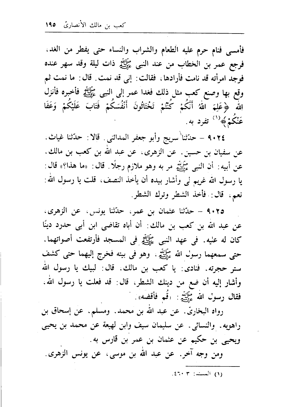 9024 - حدثنا سريج وأبو جعفر المدائني. قالا: حدثنا غياث. عن سفيان بن حسين. عن الزهري، عن عبد الله بن كعب بن مالك، عن أبيه: أن النبي - صلى الله عليه وسلم - مر به وهو ملازم رجلاً. قال: ((ماهذا؟)) قال: يارسول الله غريم لي وأشار بيده أن يأخذ النصف، قلت يارسول الله: نعم، قال: فأخذ الشطر وترك الشطر.