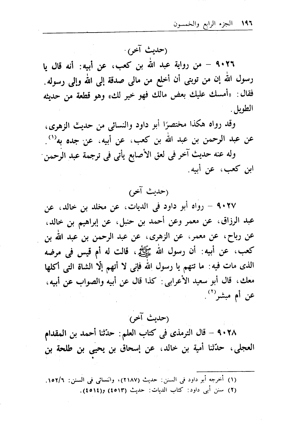 9026 - من رواية عبد الله بن كعب، عن أبيه: أنه قال يارسول الله إن من توبتي أن أخلع من مالي صدقة إلى الله وإلى رسوله. فقال: ((أمسك عليك بعض مالك فهو خير لك)) وهو قطعة من حديثه الطويل.