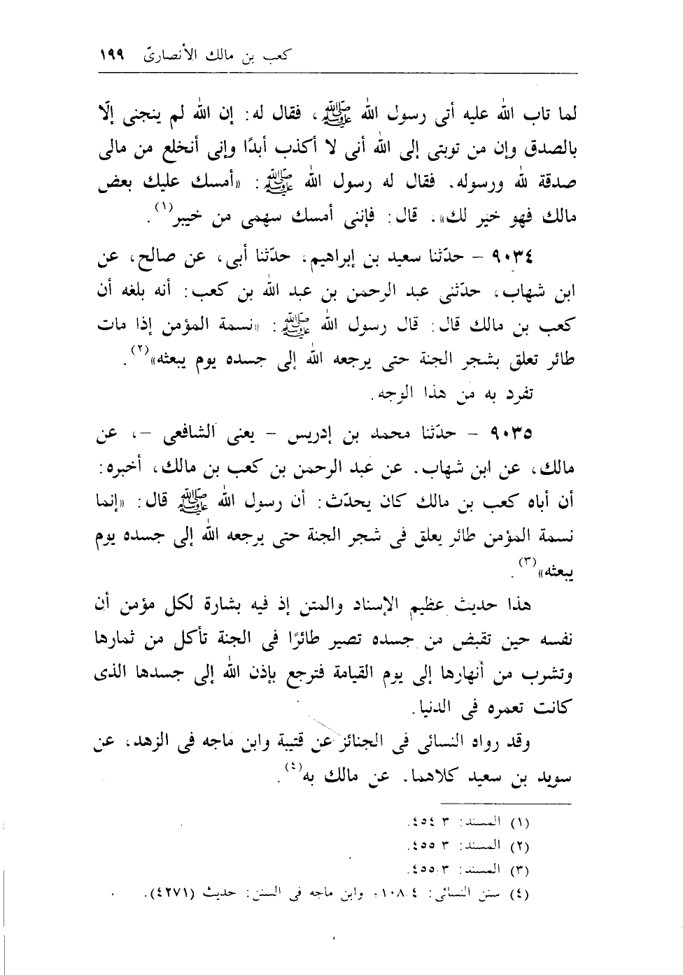 9035 - حدثنا محمد بن إدريس-يعني الشافعي-، عن مالك، عن ابن شهاب، عن عبد الرحمن بن كعب بن مالك، أخبره: أن أباه كعب بن مالك كان يحدث: أن رسول الله - صلى الله عليه وسلم - قال: ((إنما نسمة المؤمن طائر يعلق في شجر الجنة حتى يرجعه الله إلى جسده يوم يبعثه)) (¬1) .