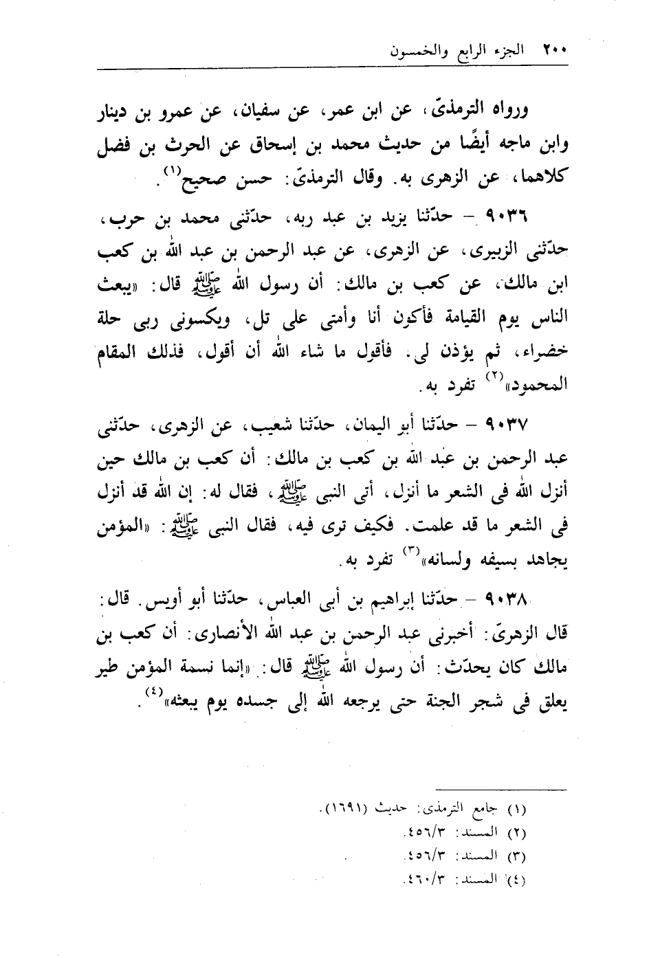 9036 - حدثنا يزيد بن عبد ربه، حدثني محمد بن حرب، حدثني الزبير، عن الزهري، عن عبد الرحمن بن عبد الله بن كعب بن مالك، عن كعب بن مالك: أن رسول الله - صلى الله عليه وسلم - قال: ((يبعث الناس يوم القيامة فأكون أنا وأمتي على تل، ويكسوني ربي حلة خضراء، ثم يؤذن لي، فأقول ماشاء الله أن أقول، فذلك المقام المحمود)) (¬1) . تفرد به.