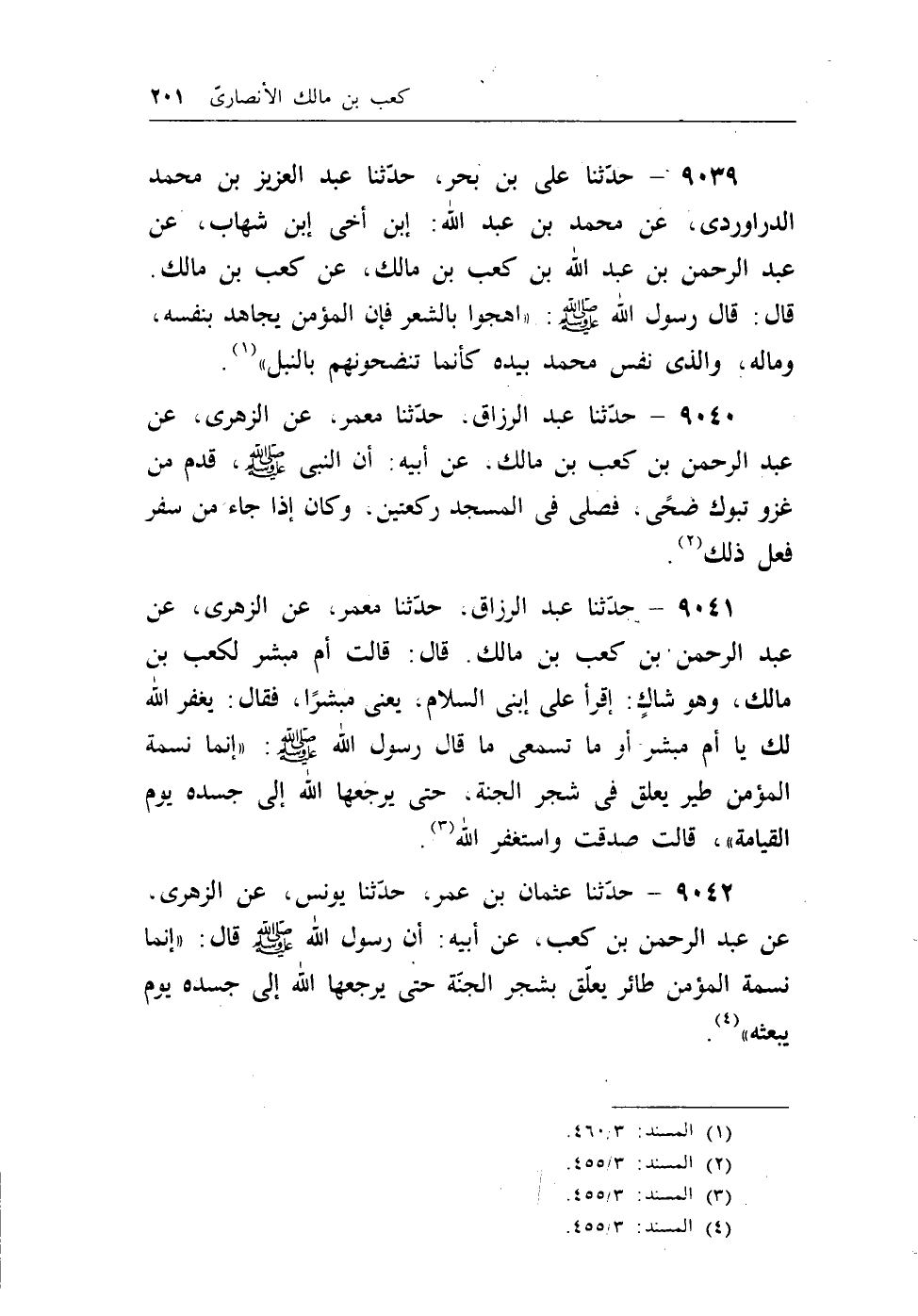 9042 - حدثنا عثمان بن عمر، حدثنا يونس، عن الزهري، عن عبد الرحمن ابن كعب، عن أبيه: أن رسول الله - صلى الله عليه وسلم - قال: ((إنما نسمة المؤمن طائر يعلق بشجر الجنة حتى يرجعها الله إلى جسده يوم يبعثه)) (¬4) .