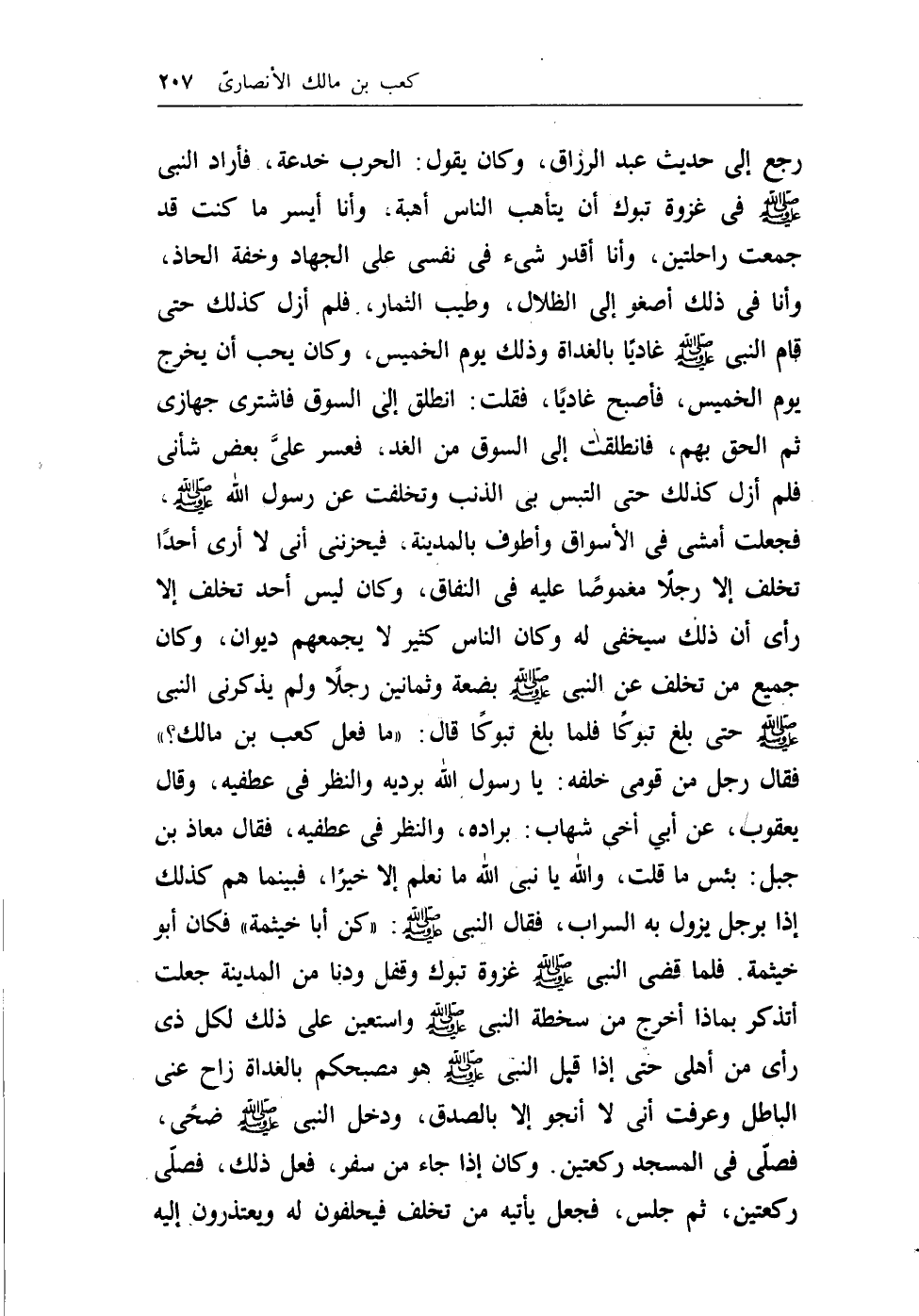 رجع إلى حديث عبد الرزاق، وكان يقول: الحرب خدعة، فأراد النبي - صلى الله عليه وسلم - في غزوة تبوك أن يتأهب الناس أهبة، وأنا أيسر ماكنت قد جمعت راحلتين، وأنا أقدر شيء في نفسي على الجهاد وخفة الحاذ، وأنا في ذلك أصغو إلى الظلال، وطيب الثمار، فلم أزل كذلك حتى قام النبي - صلى الله عليه وسلم - غادياً بالغداة وذلك يوم الخميس، وكان يحب أن يخرج يوم الخميس، فأصبح غادياً، فقلت: انطلق إلى السوق فاشترى جهازي ثم الحق بهم، فانطلقت إلى السوق من الغد، فعسر عليَّ بعض شأني فلم أزل كذلك حتى التبس بي الذنب وتخلفت عن رسول الله - صلى الله عليه وسلم -، فجعلت أمشي في الأسواق وأطوف بالمدينة، فيحزنني أني لا أرى أحداً تخلف إلا رجلاً مغموصاً عليه في النفاق، وكان ليس أحد تخلف إلا رأى أن ذلك سيخفي له وكان الناس كثير لايجمعهم ديوان، وكان جميع من تخلف عن النبي - صلى الله عليه وسلم - بضعة وثمانين رجلاً ولم يذكرني النبي - صلى الله عليه وسلم - حتى بلغ تبوكاً فلما بلغ تبوكاً قال: ((مافعل كعب بن مالك؟)) فقال رجل من قومي خلفه: يارسول الله برديه والنظر في عطفيه، وقال يعقوب، عن أبي أخي شهاب: براده، والنظر في عطفيه، فقال معاذ ابن جبل: بئس ماقلت، والله يانبي الله مانعلم إلا خيراً، فبينما هم كذلك إذا برجل يزول به السراب، فقال النبي - صلى الله عليه وسلم -: ((كن ابا خيثمة)) فكان أبو خيثمة. فلما قضى النبي - صلى الله عليه وسلم - غزوة تبوك وقفل ودنا من المدينة جعلت أتذكر بماذا أخرج من سخطة النبي - صلى الله عليه وسلم - واستعين على ذلك لكل ذي رأى من أهلي حتى إذا قبل النبي - صلى الله عليه وسلم - هو مصبحكم بالغداة زاح عني الباطل وعرفت أني لا أنجو إلا بالصدق، ودخل النبي - صلى الله عليه وسلم - ضحى، فصلى في المسجد ركعتين.