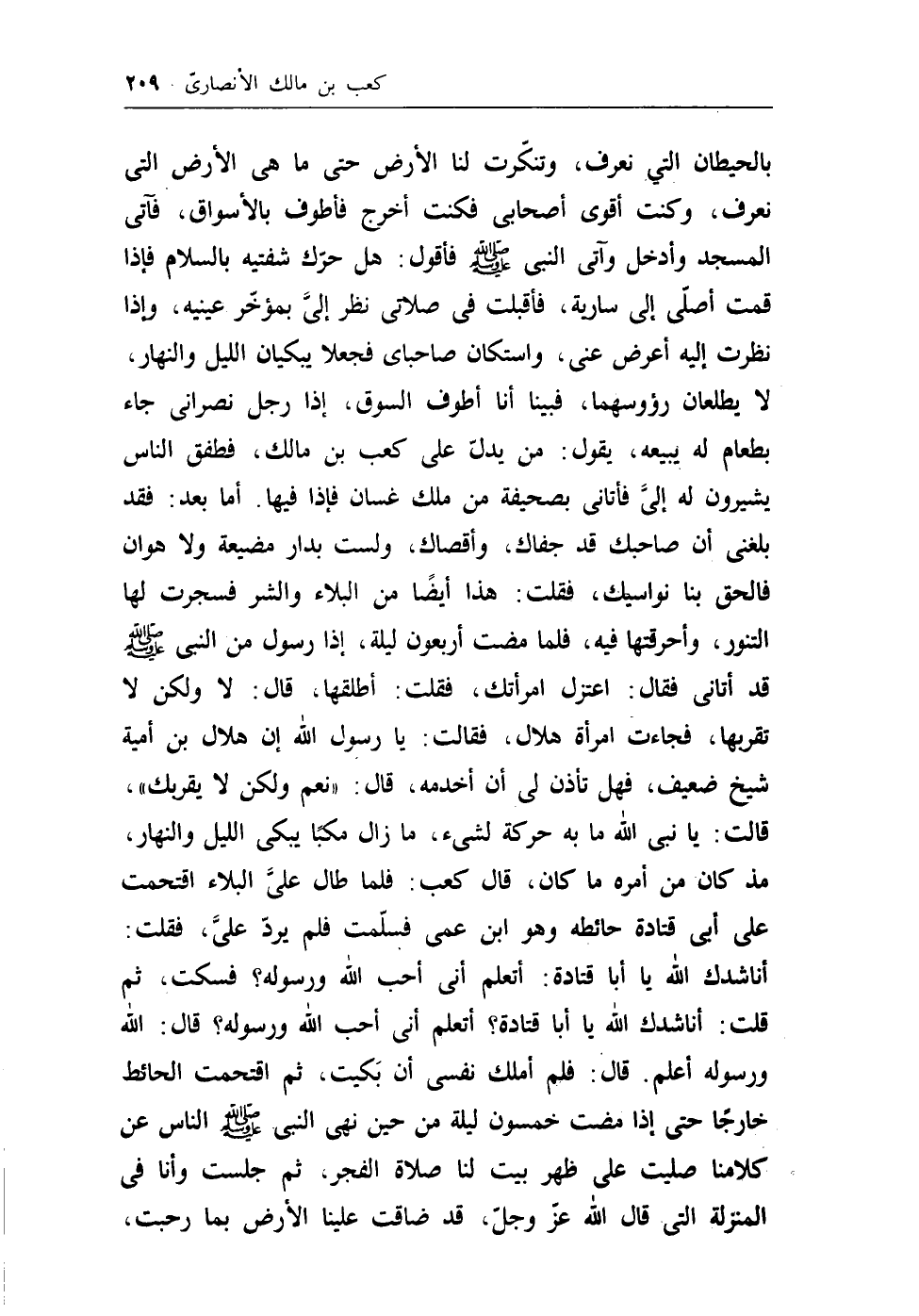 بالحيطان التي نعرف، وتنكرت لنا الأرضي حتى ماهي الرض التي نعرف، وكنت أقوى أصحابي فكنت أخرج فأطوف بالأسواق، فآتي المسجد وأدخل وآتي النبي - صلى الله عليه وسلم - فأقول: هل حرك شفتيه بالسلام فإذا قمت أصلي إلى سارية، فأقبلت في صلاتي نظر إليَّ بمؤخر عينيه، وإذا نظرت إليه أعرض عني، واستكان صاحباى فجعلا يبكيان الليل والنهار، لايطلعان رؤوسهما، فبينا أنا أطوف السوق، إذا رجل نصراني جاء بطعام له يبيعه، يقول: من يدل على كعب ابن مالك، فطفق الناس يشيرون له إليَّ فأتاني بصحيفة من ملك غسان فإذا فيها. أما بعد: فقد بلغني أن صاحبك قد جفاك، وأقصاك، ولست بدار مضيعة ولا هوان فالحق بنا نواسيك، فقلت: هذا أيضاً من البلاء والشر فسجرت لها التنور، وأحرقتها فيه، فلما مضت أربعون ليلة، إذا رسول من النبي - صلى الله عليه وسلم - قد أتاني فقال: اعتزل إمرأتك، فقلت: أطلقها، قال: لا ولكن لاتقربها، فجاءت إمرأة هلال، فقالت: يارسول الله إن هلال بن أمية شيخ ضعيف، فهل تأذن لي أن أخدمه، قال: ((نعم ولكن لايقربك)) ، قالت: يانبي الله مابه حركة لشيء، مازال مكباً يبكي الليل والنهار، مذ كان من أمره ماكان، قال كعب: فلما طال عليَّ البلاء اقتحمت على أبي قتادة حائطة وهو ابن عمي فسلمت فلم يرد عليَّ، فقلت: أناشدك الله ياأبا قتادة: أتعلم أني أحب الله ورسوله؟ فسكت، ثم قلت: أناشدك الله ياأبا قتادة؟ أتعلم أني أحب الله ورسوله؟ قال: الله ورسوله أعلم.
