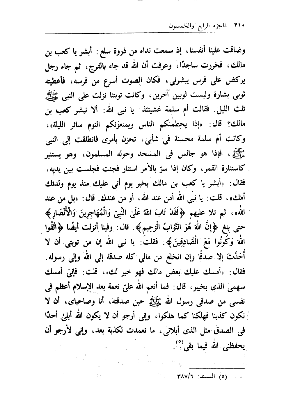 وضاقت علينا انفسنا، إذ سمعت نداء من ذروة سلع: أبشر ياكعب بن مالك، فخررت ساجداً، وعرفت أن الله قد جاء بالفرج، ثم جاء رجل يركض على فرس يبشرني، فكان الصوت أسرع من فرسه، فأعطيته ثوبي بشارة ولبست ثوبين آخرين، وكانت توبتنا نزلت على النبي - صلى الله عليه وسلم - ثلث الليل. فقالت أم سلمة غشيتئذ: يانبي الله: ألا نبشر كعب بن مالك؟ قال: ((إذا يحطمنكم الناس ويمنعونكم النوم سائر الليلة)) ، وكانت أم سلمة محسنة في شأني، تحزن بأمري فانطلقت إلى النبي - صلى الله عليه وسلم -، فإذا هو جالس في المسجد وحوله المسلمون، وهو يستنير كاستنارة القمر، وكان إذا سر بالأمر استنار فجئت فجلست بين يديه، فقال: ((أبشر ياكعب بن مالك بخير يوم أتى عليك منذ يوم ولدتك أمك)) ، قلت: يانبي الله أمن عند الله، أو من عندك. قال: ((بل من عند الله)) ، ثم تلا عليهم {لَقَدْ تَابَ اللهُ عَلَى النَّبِىّ وَالمُهَاجِرِينَ وَالأَنْصًارِ} حتى بلغ {إِنَّ اللهَ هُوَ التَّوَّابُ الرَّحِيمِ} . قال: وفينا أنزلت أيضاً {اتَّقُوا اللهً وًكُونُوا مَعَ الصَّادِقِينَ} . فقلت: يانبي الله إن من توبتي أن لا أُحدث إلا صدقاً وإن انخلع من مالي كله صدقة إلى الله وإلى رسوله.