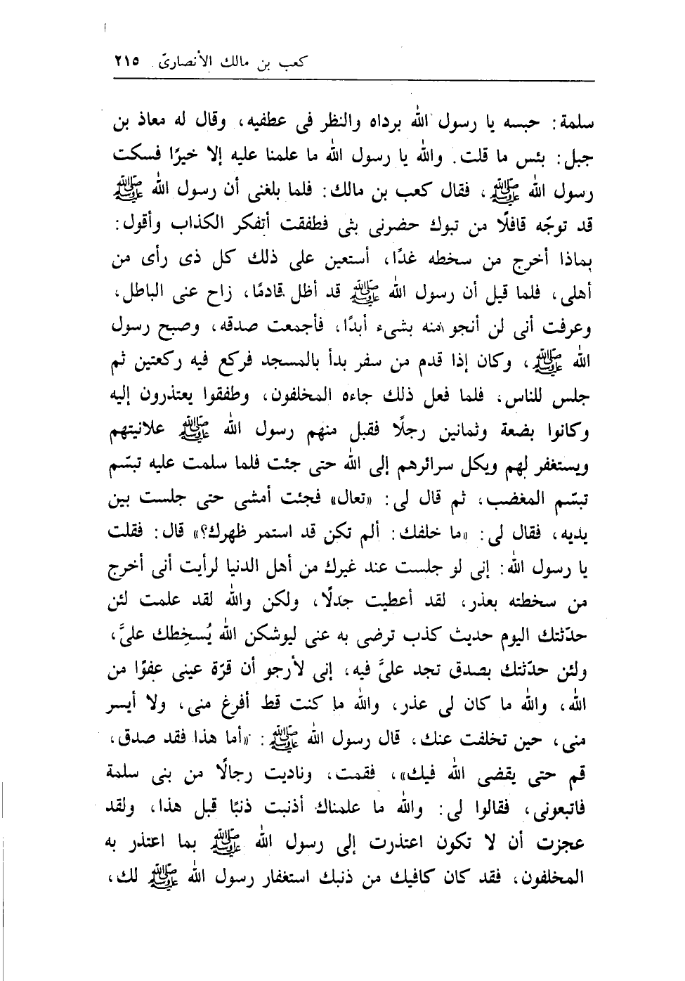 والله يارسول الله ماعلمنا عليه إلا خيراً فسكت رسول الله - صلى الله عليه وسلم -، فقال كعب بن مالك: فلما بغني أن رسول الله - صلى الله عليه وسلم - قد توجه قافلاً من تبوك حضرني بثي فطفقت أتفكر الكذاب وأقول: بماذا أخرج من سخطه غداً، أستعين على ذلك كل ذي رأي من أهلي، فلما قيل أن رسول الله - صلى الله عليه وسلم - قد أظل قادماً، زاح عني الباطل، وعرفت أني لن أنجو منه بشيء أبداً، فاجمعت صدقه، وصبح رسول الله - صلى الله عليه وسلم -، وكان إذا قدم من سفر بدأ بالمسجد فركع فيه ركعتين ثم جلس للناس، فلما فعل ذلك جاءه المخلفون، وطفقوا يعتذرون إليه وكانوا بضعة وثمانين رجلاً فقبل منهم رسول الله - صلى الله عليه وسلم - علانيتهم ويستغفر لهم وبكل سرائرهم إلى الله حتى جئت فلما سلمت عليه تبسم تبسم المغضب، ثم قال لي: ((تعال)) فجئت امشي حتى جلست بين يديه، فقال لي: ((ماخلفك: ألم تكن قد استمر ظهرك؟)) قال: فقلت يارسول الله: إني لو جلست عند غيرك من أهل الدنيا لرأيت أني أخرج من سخطته بعذر، لقد أعطيت جدلاً، ولكن والله لقد علمت لئن حدثتك اليوم حديث كذب ترضى به عني ليوشكن الله يسخطك عليَّ، ولئن حدثتك بصدق تجد عليَّ فيه، إني لأرجو أن قرة عيني عفواً من الله، والله ماكان لي عذر، والله ماكنت قط أفرغ مني، ولا أيسر مني، حين تخلفت عنك، قال رسول الله - صلى الله عليه وسلم -: ((أما هذا فقد صدق، قم حتى يقضي الله فيك)) ، فقمت، وناديت رجالاً من بني سلمة فاتبعوني، فقالوا لي: والله ماعلمناك أذنبت ذنباً قبل هذا، ولقد عجزت أن لاتكون اعتذرت إلى رسول الله - صلى الله عليه وسلم - بما اعتذر به المخلفون، فقد كان كافيك من ذنبك استغفار رسول الله - صلى الله عليه وسلم - لك،