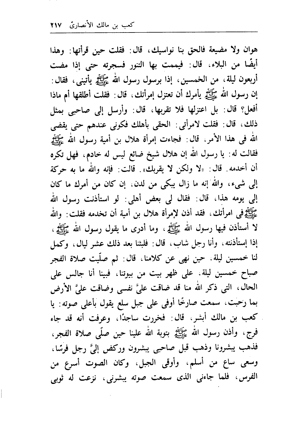 صاحبي بمثل ذلك، قال: فقلت لإمرأتي: إلحقي بأهلك فكوني عندهم حتى يقضي الله في هذا الأمر، قال: فجاءت إمرأة هلال بن أمية رسول الله - صلى الله عليه وسلم - فقالت له: يارسول الله إن هلال شيخ ضائع ليس له خادم، فهل تكره أن أخدمه. قال: ((لا ولكن لايقربك)) . قالت: فإنه والله مابه حركة إلى شيء، والله إنه مازال يبكي من لدن، إن كان من أمرك ماكان إلى يومه هذا، قال: فقال لي بعض أهلي: لو استأذنت رسول الله - صلى الله عليه وسلم - في إمرأتك، فقد أذن لإمرأة هلال ابن أمية أن تخدمه فقلت: والله لا أستأذن فيها رسول الله - صلى الله عليه وسلم -، وما أدري مايقول رسول الله - صلى الله عليه وسلم -، إذا إستأذنته، وأنا رجل شاب، قال: فلبثنا بعد ذلك عشر ليال، وكمل لنا خمسين ليلة، حين نهى عن كلامنا، قال: ثم صليت صلاة الفجر صباح خمسين ليلة، على ظهر بيت من بيوتنا، فبينا أنا جالس على الحال، التي ذكر الله منا قد ضاقت عليَّ نفسي وضاقت عليَّ الأرض بما رحبت، سمعت صارخاً أوفى على جبل سلع يقول بأعلى صوته: ياكعب بن مالك أبشر، قال: فخررت ساجداً، وعرفت أنه قد جاء فرج، وأذن رسول الله - صلى الله عليه وسلم - بتوبة الله علينا حين صلى صلاة الفجر، فذهب يبشرونا وذهب قبل صاحبي يبشرون وركض إليَّ رجل فرساً، وسعى ساع من أسلم، وأوقى الجبل، وكان الصوت أسرع من الفرس، فلما جاءني الذي سمعت صوته يبشرني، نزعت له ثوبي