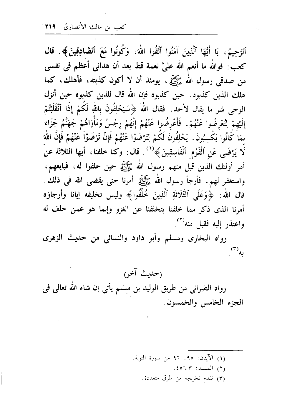 قال كعب: فوالله ماأنعم الله عليَّ نعمة قط بعد أن هداني أعظم في نفسي من صدقي رسول الله - صلى الله عليه وسلم -، يومئذ أن لاأكون كذبته، فأهلك، كما هلك الذين كذبوه، حين كذبوه فإن الله قال للذين كذبته، فأهلك، كما هلك الذين كذبوه، حين كذبوه فإن الله قال للذين كذبوه حين أنزل الوحي شر مايقال لأحد، فقال الله {سَيَحْلِفُونَ بِاللَّهِ لَكُمْ إِذَا انْقَلَبْتُمْ إِلَيْهِمْ لِتُعْرِضُوا عَنْهُمْ فَأَعْرِضُوا عَنْهُمْ إِنَّهُمْ رِجْسٌ وَمَأْوَاهُمْ جَهَنَّمُ جَزَاءً بِمَا كَانُوا يَكْسِبُونَ، يَحْلِفُونَ لَكُمْ لِتَرْضَوْا عَنْهُمْ فَإِنْ تَرْضَوْا عَنْهُمْ فَإِنَّ اللَّهَ لا يَرْضَى عَنِ الْقَوْمِ الْفَاسِقِينَ} (¬1) . قال: وكنا خلفنا، ايها الثلاثة عن أمر أولئك الذين قبل منهم رسول الله - صلى الله عليه وسلم - حين حلفوا له، فبايعهم، واستغفر لهم، فأرجأ رسول الله - صلى الله عليه وسلم - أمرنا حتى يقضي الله في ذلك. قال الله: {وَعَلَى الثَّلاثَةِ الَّذِينَ خُلِّفُوا} وليس تخليفه إيانا وأرجاؤه أمرنا الذي ذكر مما خلفنا بتخلفنا عن الغزو وإنما هو عمن حلف له واعتذر إليه فقبل منه (¬2) .