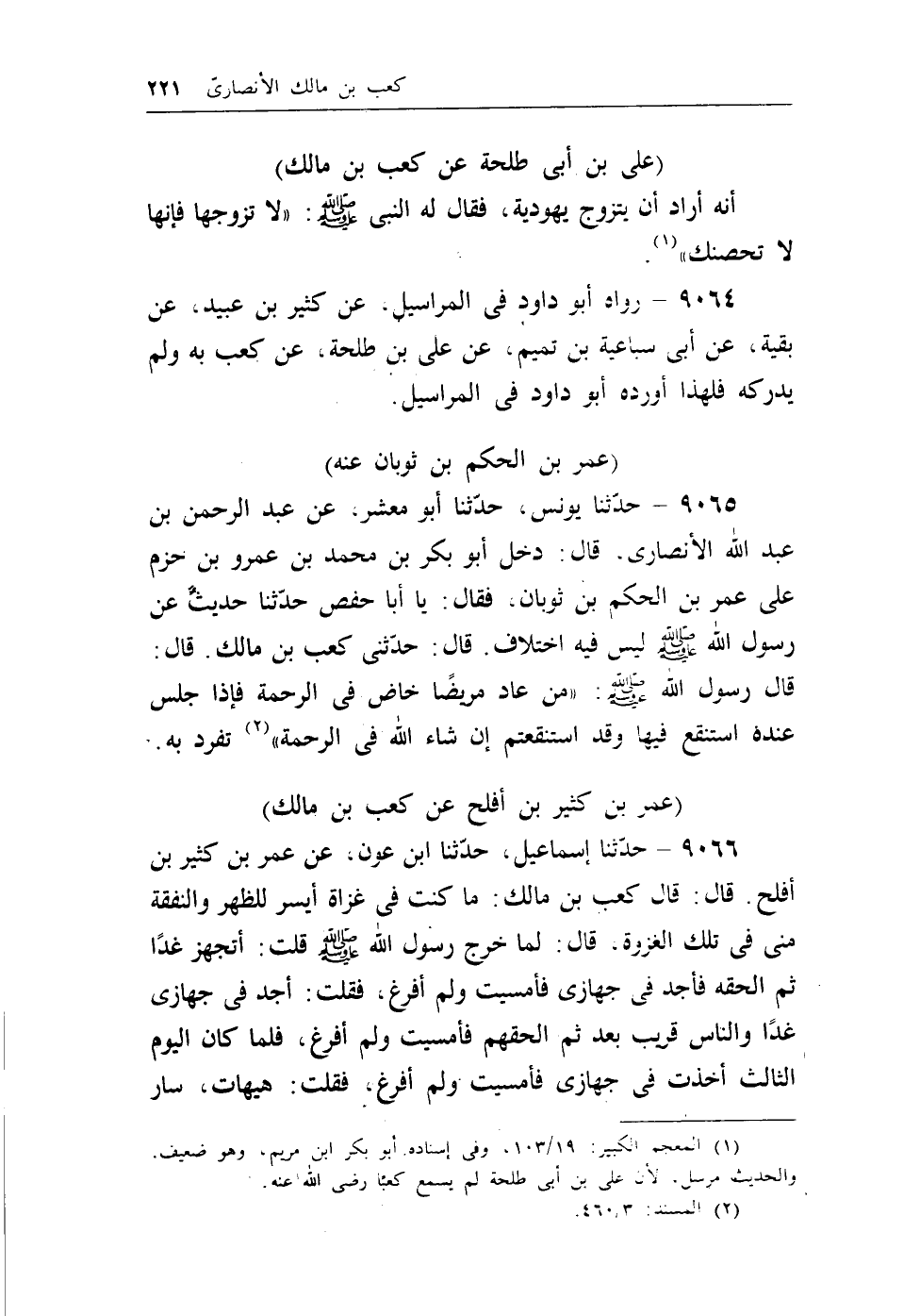 9064 - رواه أبو داود في المراسيل، عن كثير بن عبيد، عن بقية، عن أبي سباعية بن تميم، عن علي بن طلحة، عن كعب به ولم يدركه فلهذا أورده أبو داود في المراسيل.