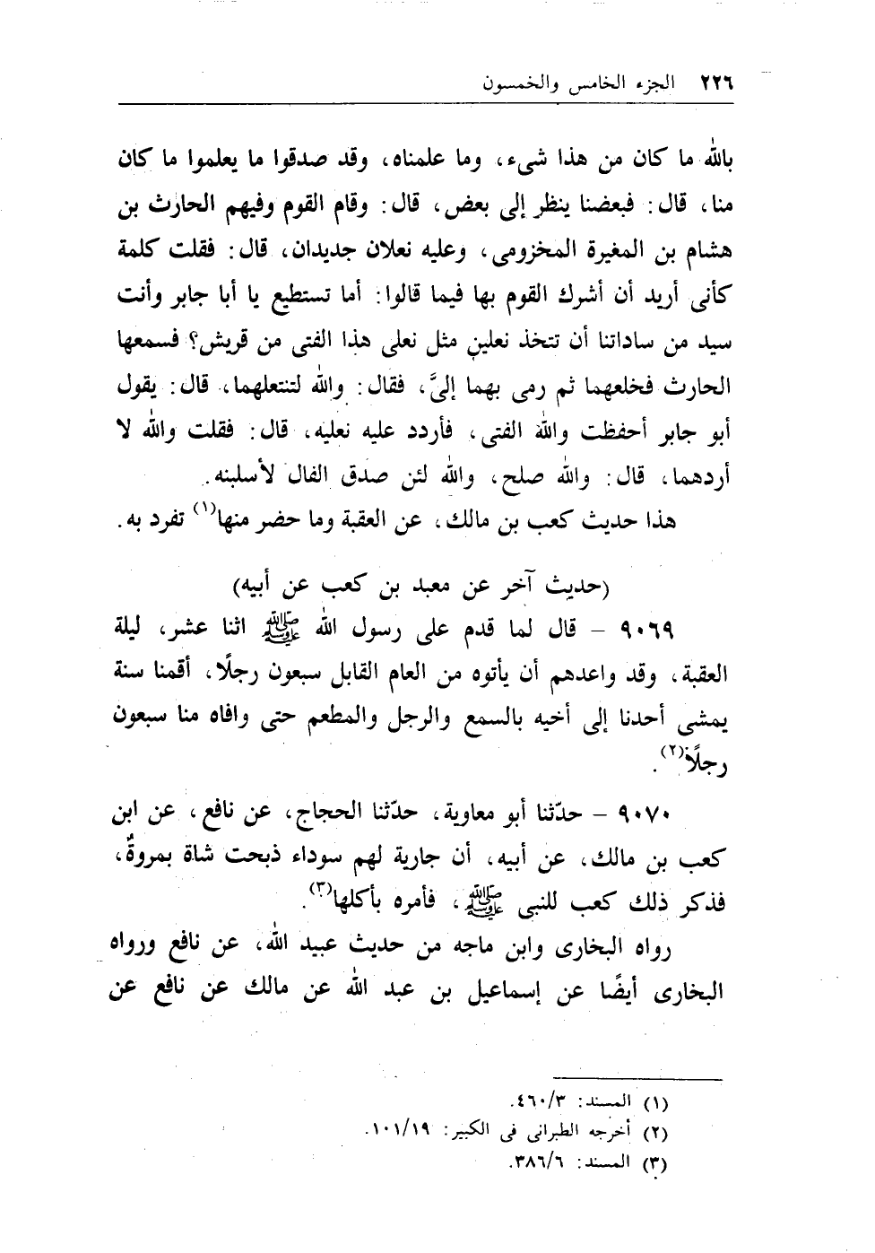 9070 - حدثنا أبو معاوية، حدثنا الحجاج، عن نافع، عن ابن كعب بن مالك، عن أبيه، أن جارية لهم سوداء ذبحت شاة بمروة، فذكر ذلك كعب للنبي - صلى الله عليه وسلم -، فأمره بأكلها (¬2) .