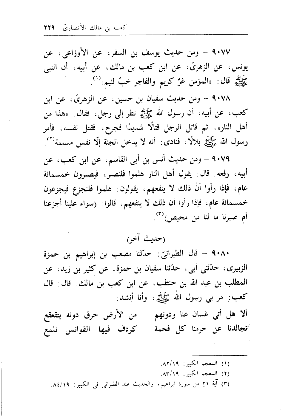 9080 - قال الطبراني: حدثنا مصعب بن إبراهيم بن حمزة الزبيري، حدثني أبي، حدثنا سفيان بن حمزة، عن كثير بن زيد، عن المطلب بن عبد الله بن حنطب، عن ابن كعب بن مالك، قال: قال كعب: مر بي رسول الله - صلى الله عليه وسلم -، وأنا أنشد: