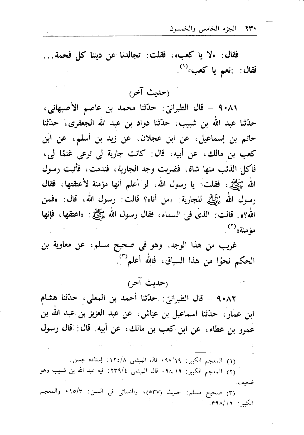 9081 - قال الطبراني: حدثنا محمد بن عاصم الأصبهاني، حدثنا عبد الله بن شبيب. حدثنا داود بن عبد الله الجعفري، حدثنا حاتم بن إسماعيل، عن ابن عجلان، عن زيد بن أسلم، عن ابن كعب بن مالك، عن أبيه، قال: كانت جارية لي ترعى غنماً لي، فأكل الذئب منها شاة، فضربت وجه الجارية، فندمت، فأتيت رسول الله - صلى الله عليه وسلم -، فقلت: يارسول الله، لو أعلم أنها مؤمنة لأعتقتها، فقال رسول الله - صلى الله عليه وسلم - للجارية: ((من أنا؟)) قالت: رسول الله، قال: ((فمن الله؟)) . قالت: الذي في السماء، فقال رسول الله - صلى الله عليه وسلم -: ((أعتقها، فإنها مؤمنة)) (¬1) .