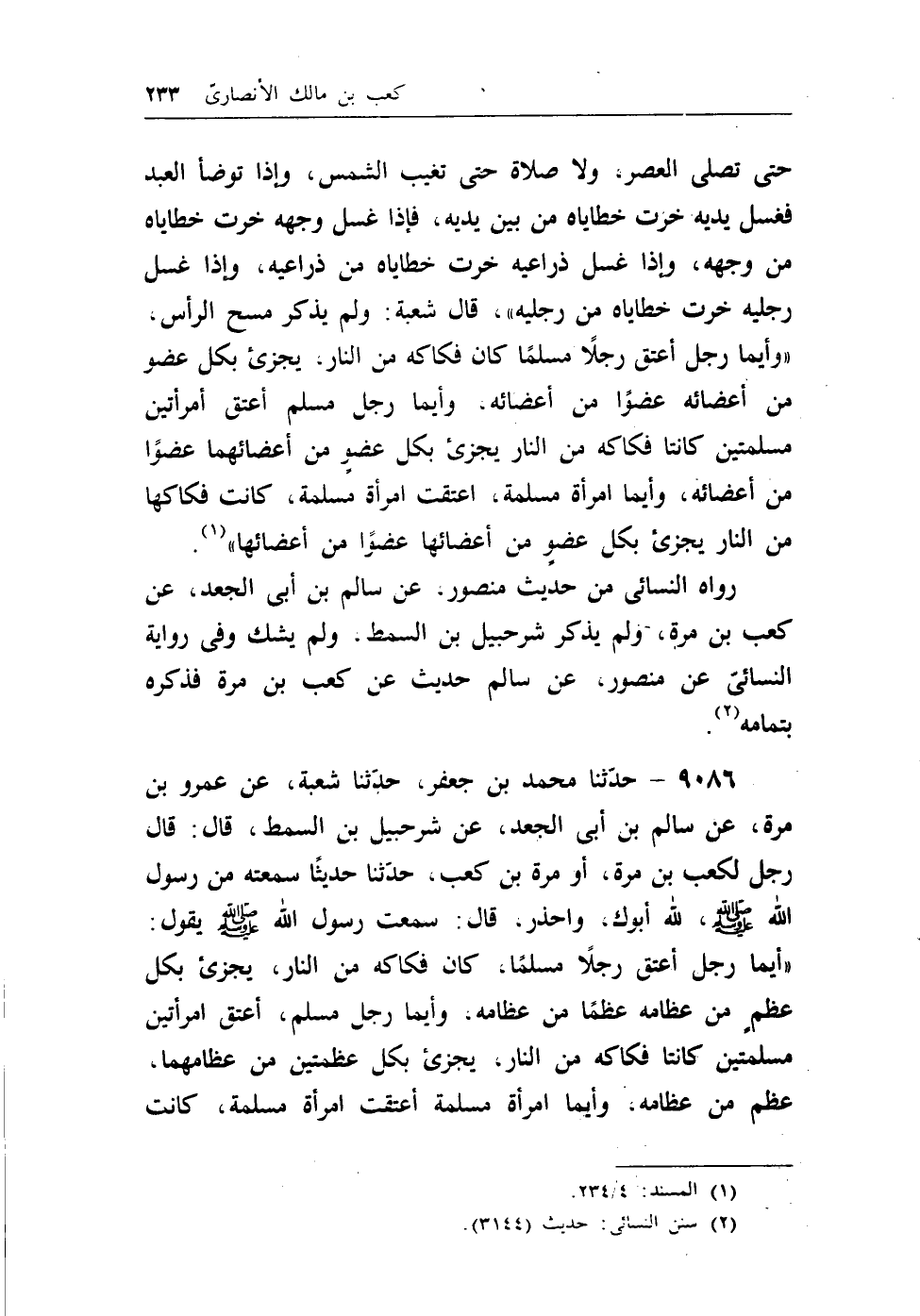 حتى تصلى العصر، ولاصلاة حتى تغيب الشمس، وإذا توضأ العبد فغسل يديه خرت خطاياه من بين يديه، فإذا غسل وجهه خرت خطاياه من وجهه، وإذا غسل ذراعيه خرت خطاياه من ذراعيه، وإذا غسل رجليه خرت خطاياه من رجليه)) ، قال شعبة: ولم يذكر مسح الرأس، ((وأيما رجل أعتق رجلاً مسلماً كان فكاكه من النار، يجزئ بكل عضو من أعضائه عضواً من أعضائه، وأيما رجل مسلم أعتق إمرأتين مسلمتين كانتا فكاكه من النار يجزئ بكل عضوٍ من أعضائهما عضواً من أعضائه، وأيما إمرأة مسلمة، اعتقت إمرأة مسلمة، كانت