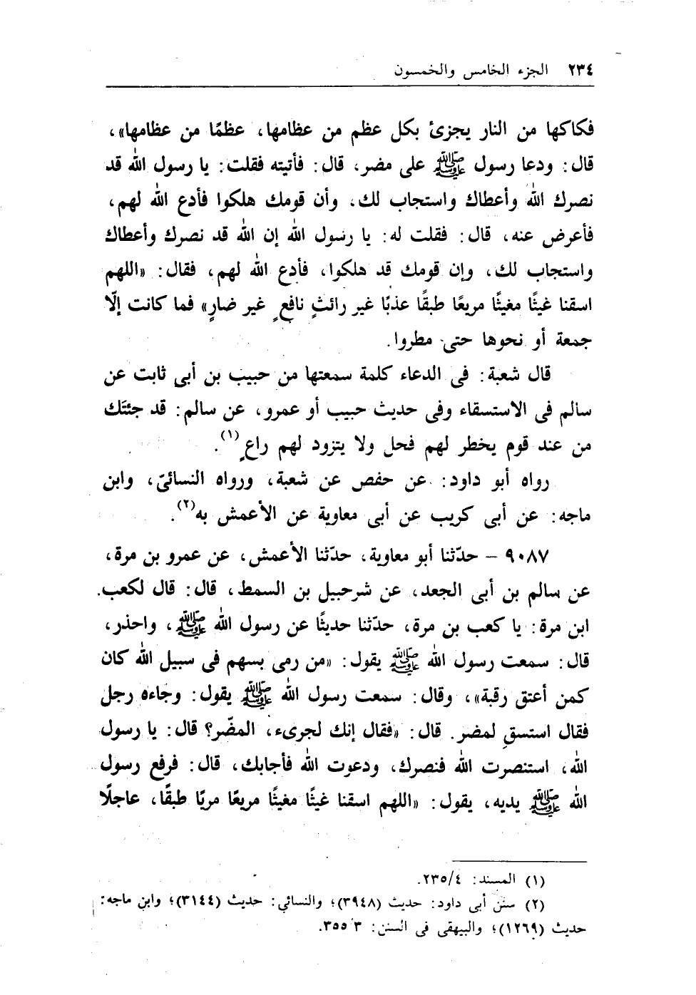9087 - حدثنا أبو معاوية، حدثنا الأعمش، عن عمرو بن مرة، عن سالم بن أبي الجعد، عن شرحبيل بن السمط، قال: قال لكعب بن مرة: ياكعب بن مرة، حدثنا حديثاً عن رسول الله - صلى الله عليه وسلم -، واحذر، قال: سمعت رسول الله - صلى الله عليه وسلم - يقول: ((من رمى بسهم في سبيل الله كان كمن أعتق رقبة)) ، وقال: سمعت رسول الله - صلى الله عليه وسلم - يقول: وجاءه رجل فقال استسق لمضر. قال: ((فقال إنك لجرئ، المضر؟ قال: يارسول الله، استنصرت الله فنصرك، ودعوت الله فأجابك، قال: فرفع رسول الله - صلى الله عليه وسلم - يديه، يقول: () اللهم اسقنا غيثاً مغيثاً مريعاً مرياً طبقاً، عاجلاً