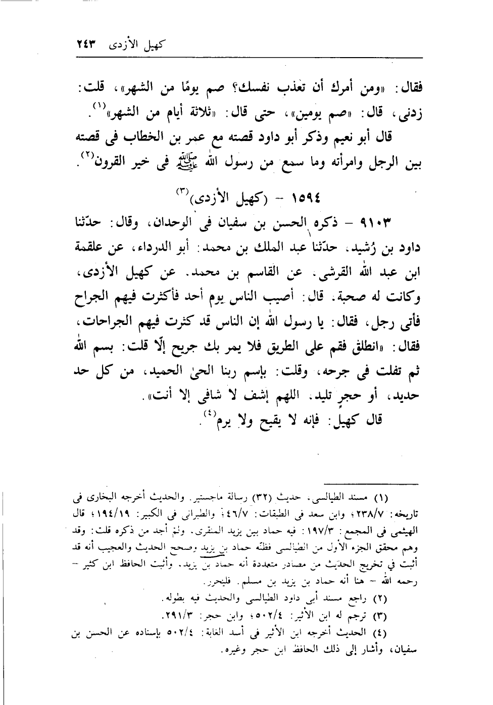 9103 - ذكره الحسن بن سفيان في الوحدان، وقال: حدثنا داود بن رشيد، حدثنا عبد الملك بن محمد: أبو الدرداء، عن علقمة بن عبد الله القرشي، عن القاسم ابن محمد، عن كهيل الأزدي، وكانت له صحبة، قال: أصيب الناس يوم أحد فأكثرت فيهم الجراح فأتى رجل، فقال: يارسول الله إن الناس قد كثرت فيهم الجراحات، فقال: ((انطلق فقم على الطريق فلايمر بك جريج إلا قلت: بسم الله ثم تفلت في جرحه، وقلت: بإسم ربنا الحي الحميد، من كل حد حديد، أو حجرٍ تليد، اللهم إشف لا شافي إلا أنت)) .