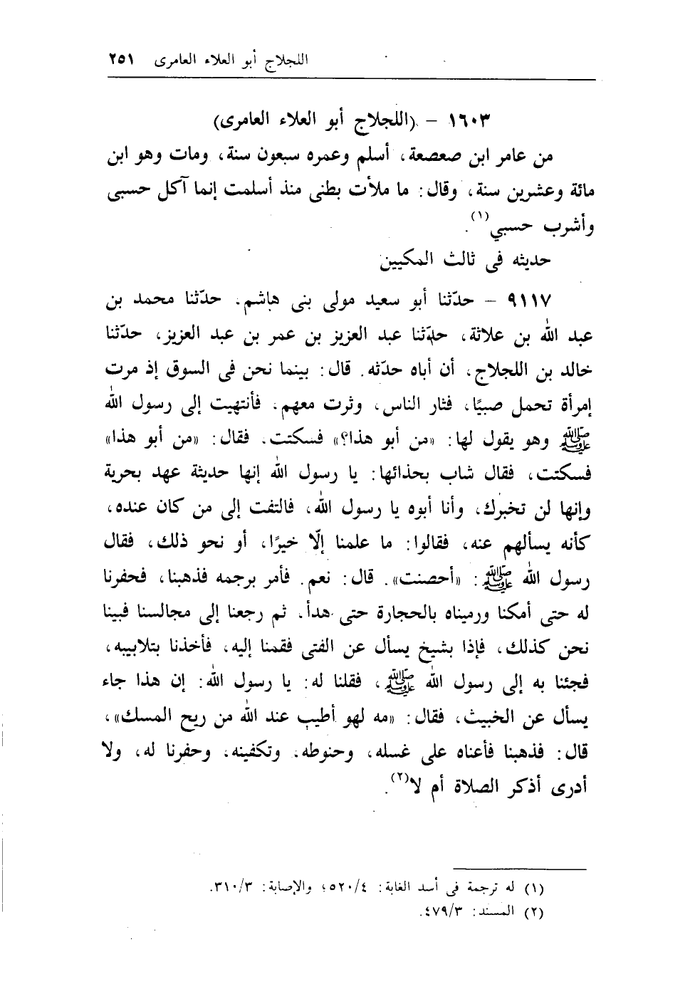 9117 - حدثنا أبو سعيد مولى بني هاشم، حدثنا محمد بن عبد الله بن علاثة، حدثنا عبد العزيز بن عمر بن عبد العزيز، حدثنا خالد بن اللجلاج، أن أباه حدثه. قال: بينما نحن في السوق إذ مرت إمرأة تحمل صبياً، فثار الناس، وثرت معهم، فأنتهيت إلى رسول الله - صلى الله عليه وسلم - وهو يقول لها: ((من أبو هذا؟)) فسكتت، فقال: ((من أبو هذا)) فسكتت، فقال شاب بحذائها: يارسول الله إنها حديثة عهد بحرية وإنها لن تخبرك، وانا أبوه يارسول الله، فالتفت إلى من كان عنده، كأنه يسألهم عنه، فقالوا: ماعلمنا إلا خيراً، أو نحو ذلك، فقال رسول الله - صلى الله عليه وسلم -: ((أحصنت)) . قال: نعم. فأمر برجمه فذهبنا، فحفرنا له حتى أمكنا ورميناه بالحجارة حتى هدأ. ثم رجعنا إلى مجالسنا فبينا نحن كذلك، فإذا بشيخ يسال عن الفتى فقمنا إليه، فأخذنا بتلابيبه، فجئنا به إلى رسول الله - صلى الله عليه وسلم -، فقلنا له: يارسول الله: إن هذا جاء يسأل عن الخبيث، فقال: ((مه لهو أطيب عند الله من ريح المسك)) ، قال: فذهبنا فأعناه على غسله، وحنوطه، وتكفينه، وحفرنا له، ولا أدري أذكر الصلاة أم لا (¬2) .