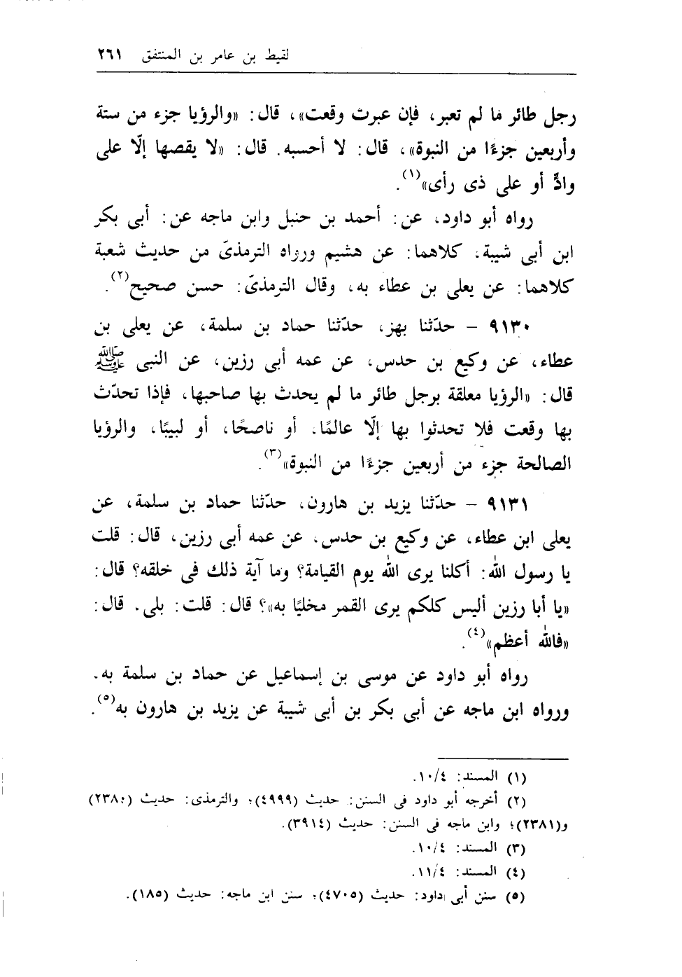 9130 - حدثنا بهز، حدثنا حماد بن سلمة، عن يعلى بن عطاء، عن وكيع بن حدس، عن عمه أبي رزين، عن النبي - صلى الله عليه وسلم - قال: ((الرؤيا معلقة برجل طائر مالم يحدث بها صاحبها، فإذا تحدث بها وقعت فلاتحدثوا بها إلا عالماً، أو ناصحاً، أو لبيباً، والرؤيا الصالحة جزء من أربعين جزءاً من النبوة)) (¬1) .