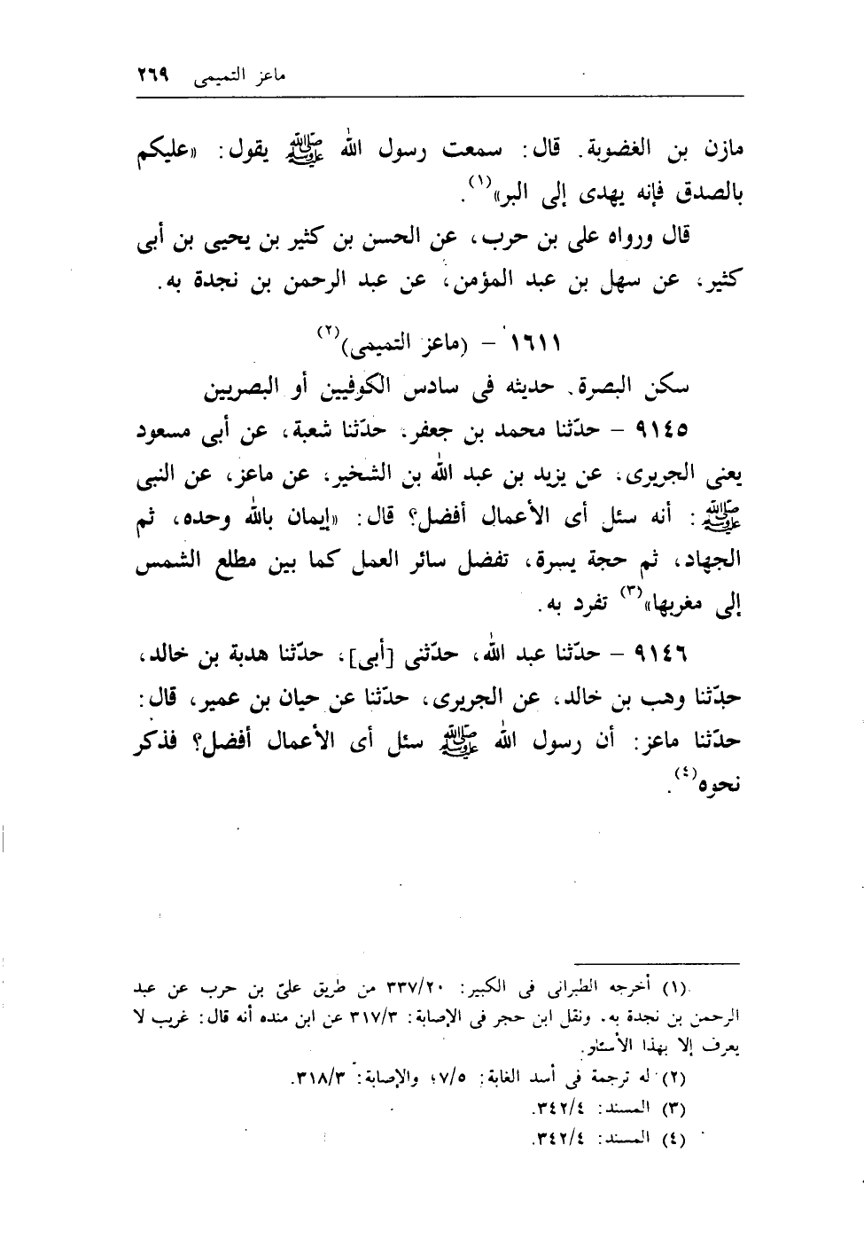 9146 - حدثنا عبد الله، حدثني [أبي] ، حدثنا هدبة بن خالد، حدثنا وهب بن خالد، عن الجريري، حدثنا عن حيان بن عمير، قال: حدثنا ماعز: أن رسول الله - صلى الله عليه وسلم - سئل أي الأعمال أفضل؟ فذكر نحوه (¬3) .