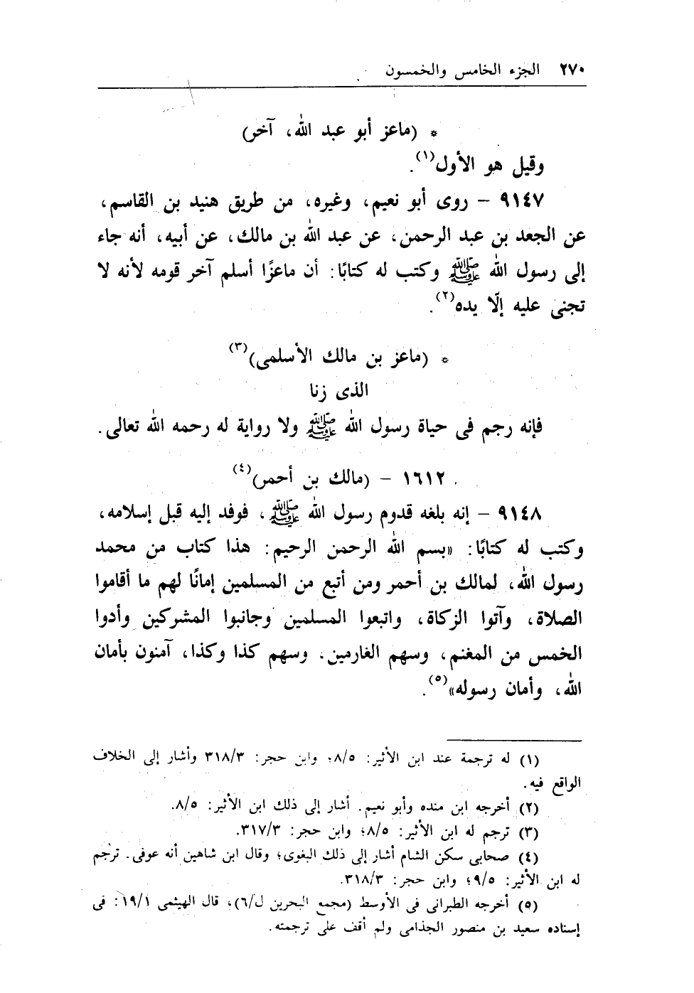 9147 - روى أبو نعيم، وغيره، من طريق هنيد بن القاسم، عن الجعد بن عبد الرحمن، عن عبد الله بن مالك، عن أبيه، أنه جاء إلى رسول الله - صلى الله عليه وسلم - وكتب له كتاباً: أن ماعزاً أسلم آخر قومه لأنه لاتجني عليه إلا يده (¬1) .