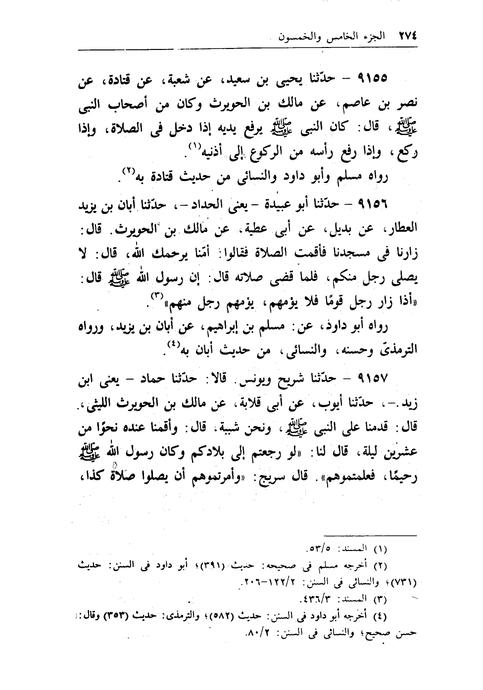 9157 - حدثنا شريح ويونس، قالا: حدثنا حماد -يعني ابن زيد-، حدثنا أيوب، عن أبي قلابة، عن مالك بن الحويرث الليثي، قال: قدمنا على النبي - صلى الله عليه وسلم -، ونحن شببة. قال: وأقمنا عنده نحواً من عشرين ليلة، قال لنا: ((لو رجعتم إلى بلادكم وكان رسول الله - صلى الله عليه وسلم - رحيماً، فعلمتموهم)) . قال سريج: ((وأمرتموهم أن يصلوا صلاة كذا،