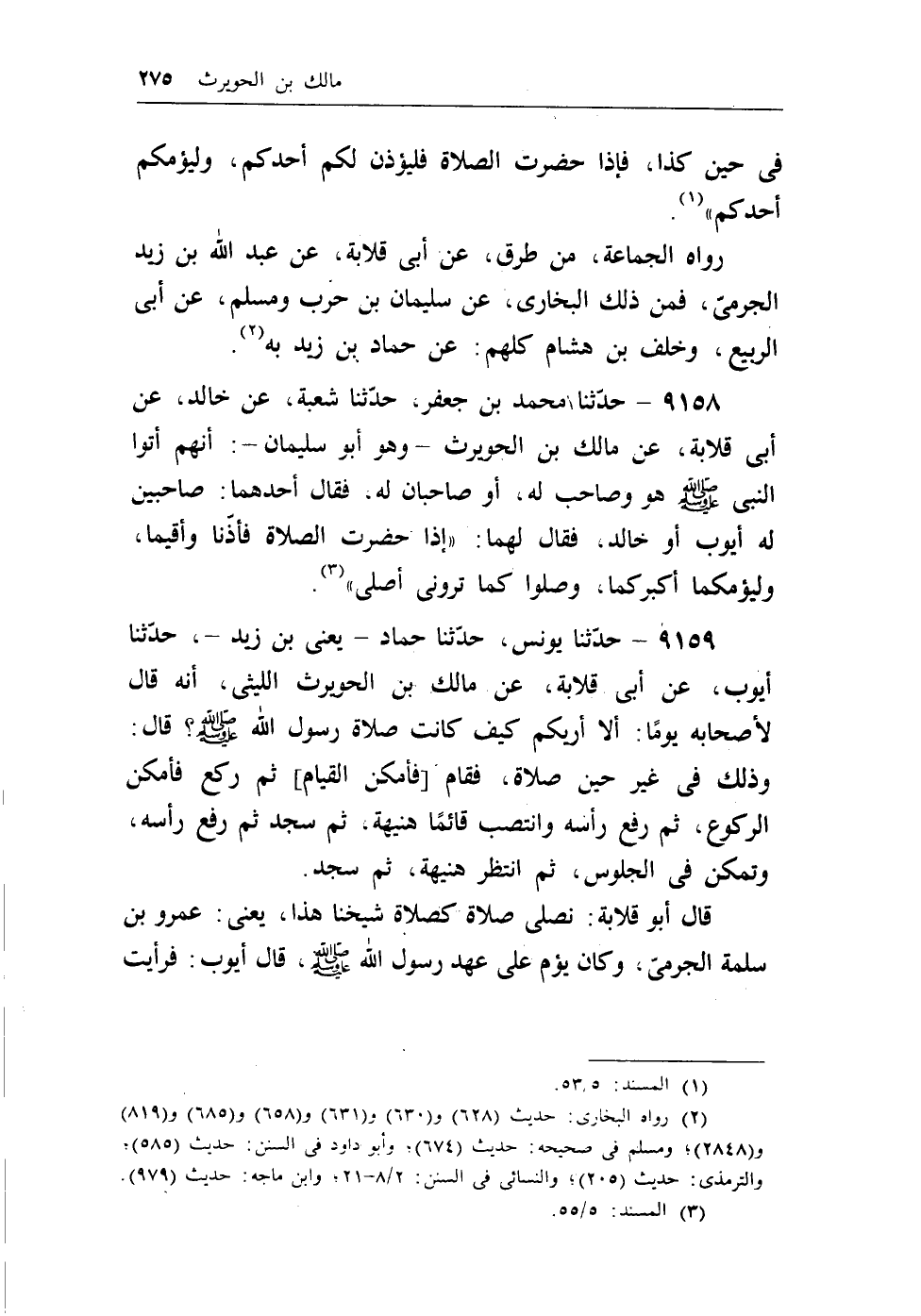 9159 - حدثنا يونس، حدثنا حماد -يعني بن زيد-، حدثنا أيوب، عن أبي قلابة، عن مالك بن الحويرث الليثي، أنه قال لأصحابه يوماً: ألا أريكم كيف كانت صلاة رسول الله - صلى الله عليه وسلم -؟ قال: وذلك في غير حين صلاة، فقام [فأمكن القيام] ثم ركع فأمكن الركوع، ثم رفع رأسه وانتصب قائماً هنيهة، ثم سجد ثم رفع رأسه، وتمكن في الجلوس، ثم انتظر هنيهة، ثم سجد.