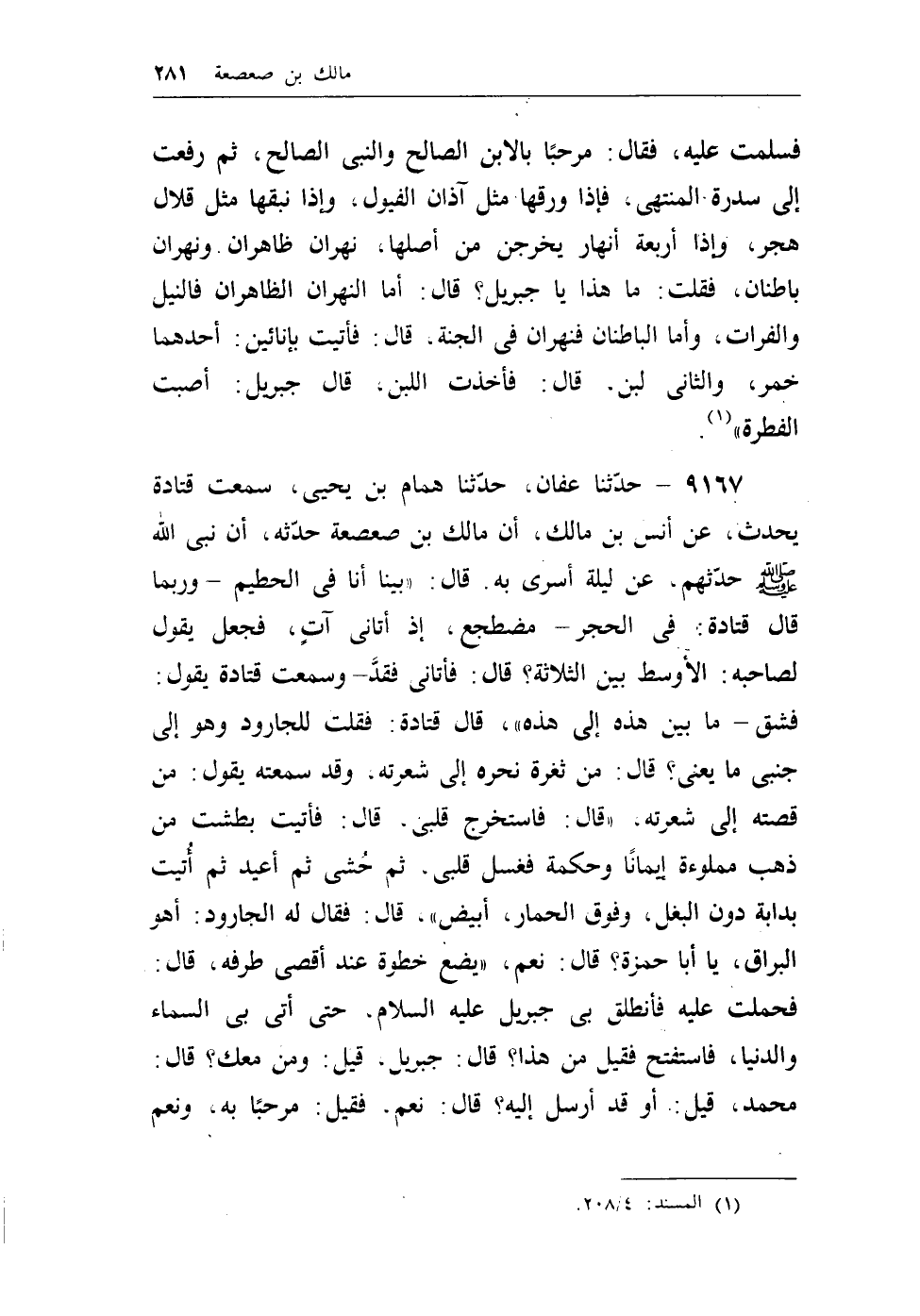 9167 - حدثنا عفان، حدثنا همام بن يحيى، سمعت قتادة يحدث، عن أنس بن مالك، أن مالك بن صعصعة حدثه، أن نبي الله - صلى الله عليه وسلم - حدثهم، عن ليلة أسري به. قال: ((بينا أنا في الحطيم -وربما قال قتادة: في الحجر- مضطجع، إذ أتاني آتٍ، فجعل يقول لصاحبه: الأوسط بين الثلاثة؟ قال: فأتاني فقدَّ - وسمعت قتادة يقول: فشق- مابين هذا إلى هذه)) ، قال قتادة: فقلت للجارود وهو إلى جنبي مايعني؟ قال: من ثغرة نحره إلى شعرته، وقد سمعته يقول: من قصته إلى شعرته، ((قال: فاستخرج قلبي، قال: فأتيت بطشت من ذهب مملوءة إيماناً وحكمة فغسل قلبي، ثم خُشي ثم أعيد ثم أُتيت بدابة دون البغل، وفوق الحمار، أبيض)) ، قال: فقال له الجارود: أهو البارق، يا أبا حمزة؟ قال: نعم، ((يضع خطوة عند أقصى طرفه، قال: فحملت عليه فأنطلق بي جبريل عليه السلام، حتى أتى بي السماء الدنيا، فاستفتح فقيل من هذا؟ قال: جبريل، قيل: ومن معك؟ قال: محمد، قيل: أو قد أرسل إليه، قال: نعم.