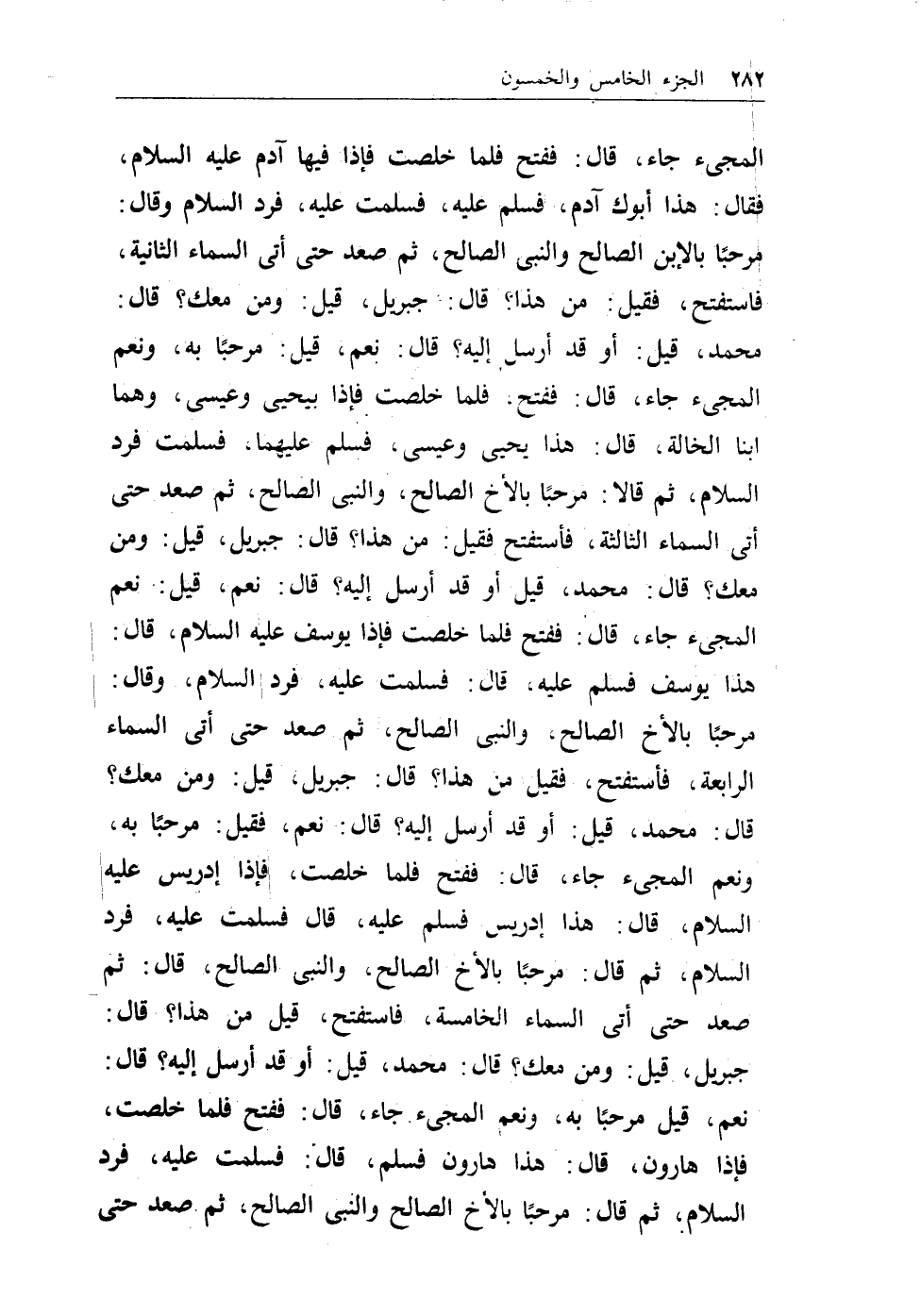 المجئ جاء، قال: ففتح فلما خلصت فإذا فيها آدم عليه السلام، فقال: هذا أبوك آدم، فسلم عليه، فسلمت عليه، فرد السلام وقال: مرحباً بالإبن الصالح والنبي الصالح، ثم صعد حتى أتى السماء الثانية، فاستفتح، فقيل: من هذا؟ قال: جبريل، قيل: ومن معك؟ قال: محمد، قيل: أو قد أرسل إليه، قال: نعم، قيل: مرحباً به، ونعم المجئ جاء، قال: ففتح، فلما خلصت فإذا بيحيى وعيسى، وهما ابنا الخالة، قال: هذا يحيى وعيسى، فسلم عليهما، فسلمت فرد السلام، ثم قالا: مرحباً بالأخ الصالح، والنبي الصالح، ثم صعد حتى أتى السماء الثالثة، فاستفتح فقيل: من هذا؟ قال: جبريل، قيل: ومن معك؟ قال: محمد، قيل أو قد أرسل إليه؟ قال: نعم، قيل: نعم المجئ جاء، قال: ففتح فلما خلصت فإذا يوسف عليه السلام، قال: هذا يوسف فسلم عليه، قال: فسلمت عليه، فرد السلام، وقال: مرحباً بالأخ الصالح، والنبي الصالح، ثم صعد حتى أتى السماء الرابعة، فاستفتح، فقيل من هذا؟ قال: جبريل، قيل: ومن معك؟ قال: محمد، قيل: أو قد أرسل ےإليه؟ قال: نعمن فقيل: مرحباً به، ونعم المجئ جاء، قال: ففتح فلما خلصت، فإذا إدريس عليه السلام، قال: هذا إدريس فسلم عليه، قال فسلمت عليه، فرد السلام، ثم قال: مرحباً بالأخ الصالح، والنبي الصالح، قال: ثم صعد حتى أتى السماء الخامسة، فاستفتح، قيل من هذا؟ قال: جبريل، قيل: مرحباً به، ونعم المجئ جاء، قال: ففتح فلما خلصت، فإذا هارون، قال: هذا هارون فسلم، قال: فسلمت عليه، فرد السلام، ثم قال: مرحباً بالأخ الصالح والنبي الصالح، ثم صعد حتى