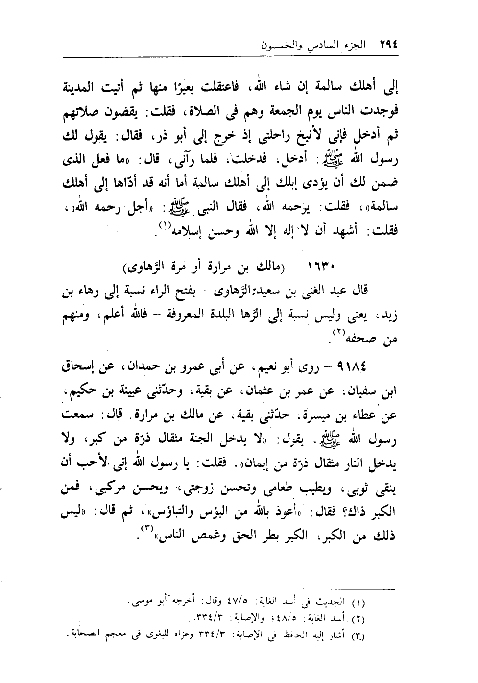 9184 - روى أبو نعيم، عن أبي عمرو بن حمدان، عن إسحاق بن سفيان، عن عمر بن عثمان، عن بقية، وحدثني عيينة بن حكيم، عن عطاء بن ميسرة، حدثني بقية، عن مالك بن مرارة. قال: سمعت رسول الله - صلى الله عليه وسلم - يقول: ((لايدخل الجنة مثقال ذرة من كبر، ولا يدخل النار مثقال ذرة من إيمان)) ، فقلت: يارسول الله إني لأحب أن ينقي ثوبي، ويطيب طعامي وتحسن زوجتي، ويحسن مركبي، فمن الكبر ذاك، فقال: ((أعوذ بالله من البؤس والتباؤس)) ، ثم قال: ((ليس ذلك من الكبر، الكبر بطر الحق وغمص الناس)) (¬2) .