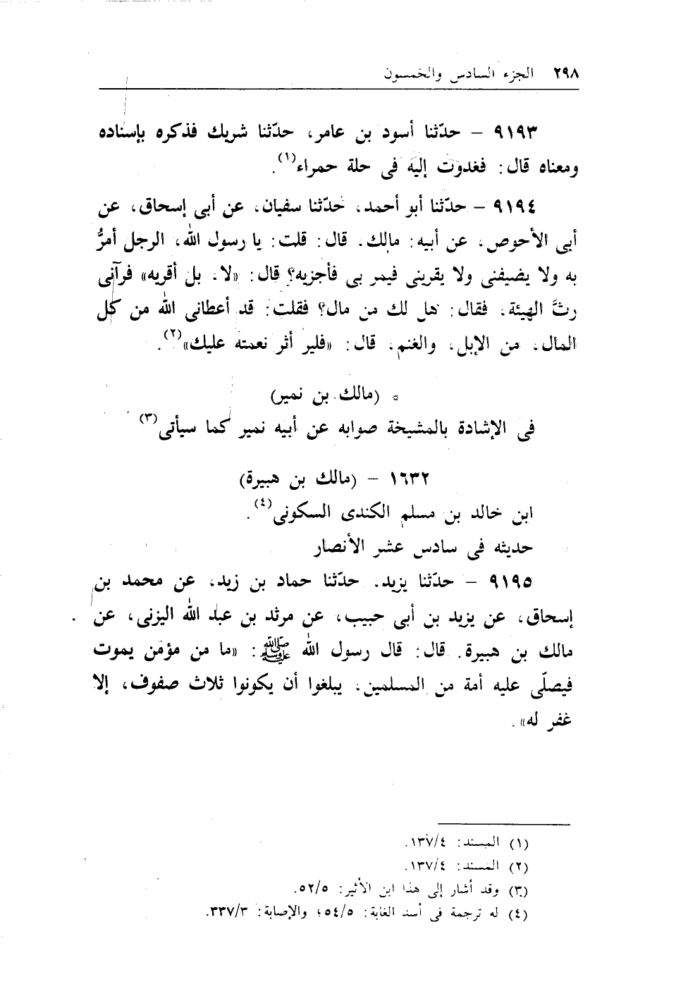 9194 - حدثنا أبو أحمد، حدثنا سفيان، عن أبي إسحاق، عن أبي الأحوص، عن أبيه: مالك، قال: قلت: يارسول الله، الرجل أمرُّ به ولايضيفني ولايقربني فيمر أبي فأجزيه؟ قال: ((لا، بل أقريه)) فرآني رثَّ الهيئة، فقال: هل لك من مال؟ فقلت: قد أعطاني الله من كل المال، من الإبل، والغنم، قال: ((فلير أثر نعمته عليك)) (¬2) .