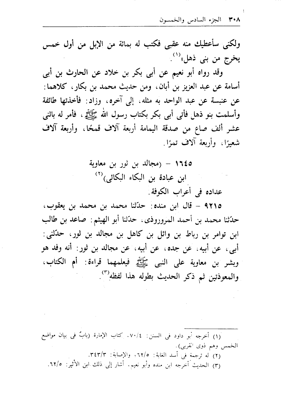 9215 - قال ابن منده: حدثنا محمد بن محمد بن يعقوب، حدثنا محمد بن أحمد المروروذي، حدثنا أبو الهيثم: صاعد بن طالب بن توامر بن رباط بن وائل بن كاهل ابن مجالد بن ثور، حدثني أبي، عن أبيه، عن جده، عن أبيه، عن مجالد بن ثور: أنه وفد هو وبشر بن معاوية على النبي - صلى الله عليه وسلم - فيعلمهما قراءة: أم الكتاب والمعوذتين ثم ذكر الحديث بطوله هذا لفظه (¬2) .